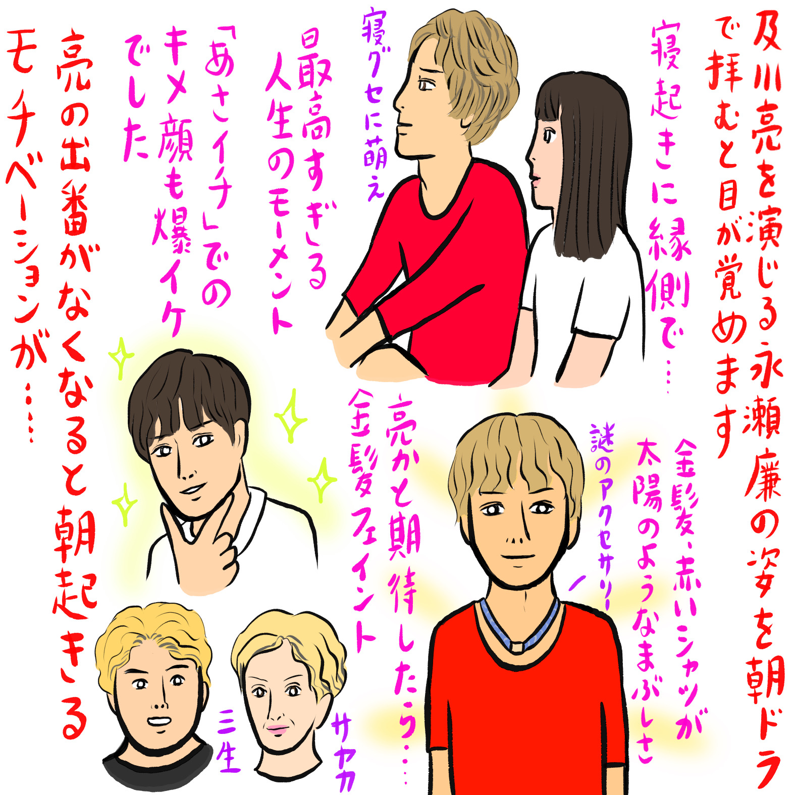 NHK連続テレビ小説『おかえりモネ』を永瀬廉めあてで、5月から毎朝のように観ていました。金髪で赤い服を着がちな及川亮は、太陽のような存在感で見るたびにまぶしくて目が覚めます。初登場は第2週。漁師として漁港で働いている亮が主人公・百音の妹、未知と立ち話している時、車が近付いたらさっと未知を引き寄せる、気配りシーンに琴線が震えました。