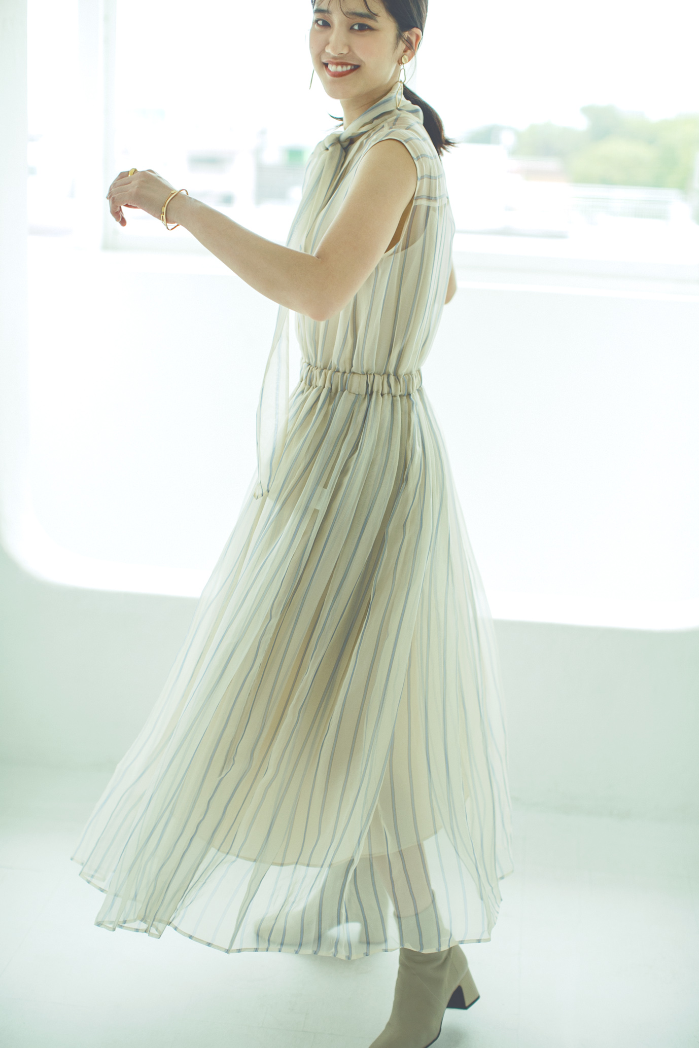 ワンピース¥105,600(ebure/ebure GINZA SIX 店)ブーツ¥46,000(ファビオ ルスコーニ/ファビオ ルスコーニ ヴィオロ 福岡店)イヤリング¥7,150〈ズー〉リング[2本セット]¥20,570〈ソコ〉(ともにZUTTOHOLIC)バングル¥148,500ブレスレット¥85,000(ともにウノアエレ/ウノアエレ ジャパン)