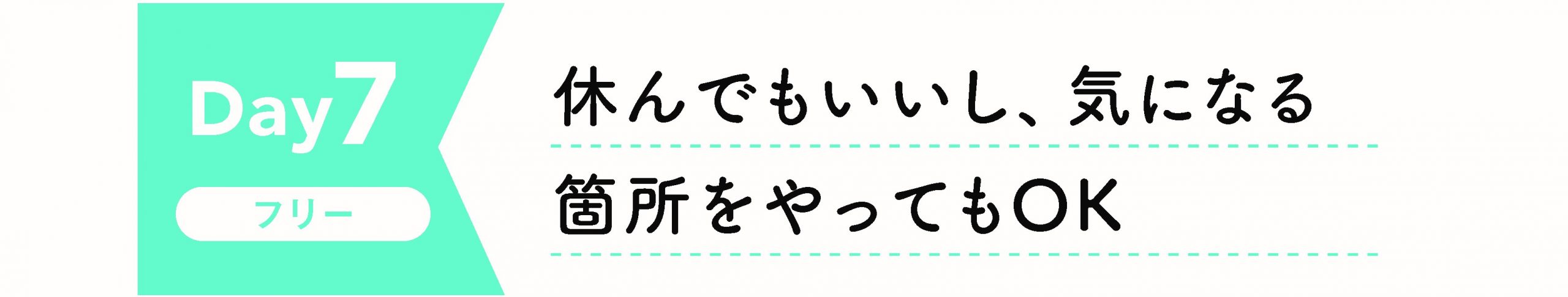 めんどくさくなってしまったら休んでもOK! Day1~6のマッサージを通しでやってみたり、気になる箇所だけ追加でやってみるのもいいですし、筋肉の場所を改めて理解したり、やり方を確認するのもいいでしょう。せっかく時間があるから+αでやりたい!場合は、バストケアをぜひ試してみて。