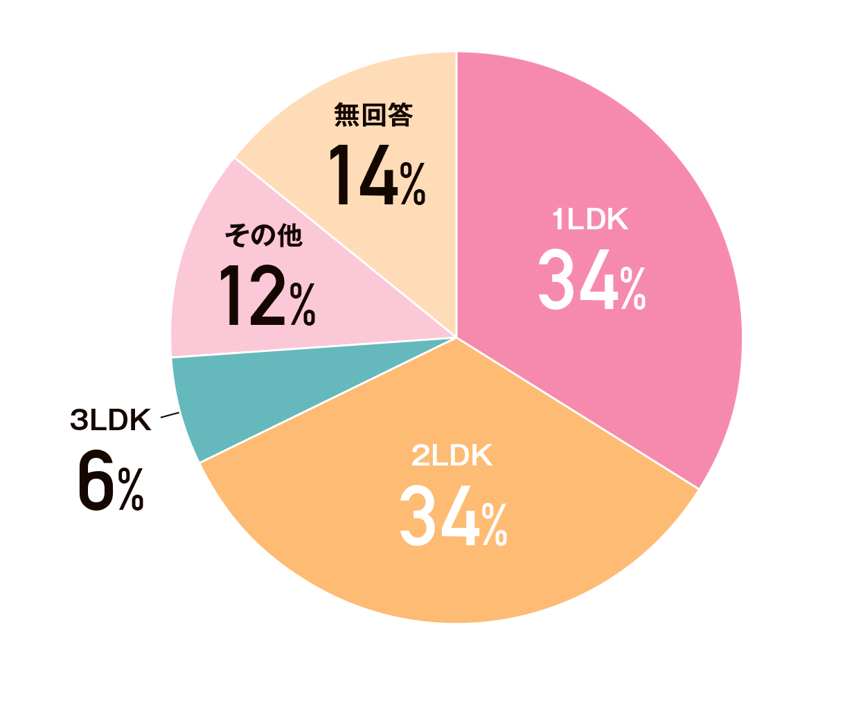 1LDKと2LDKが 同じ割合に。お金を貯めて2人のマイホームを買おうという人 が多い様子。彼がかなり年上の場合は、3L DKという人も。