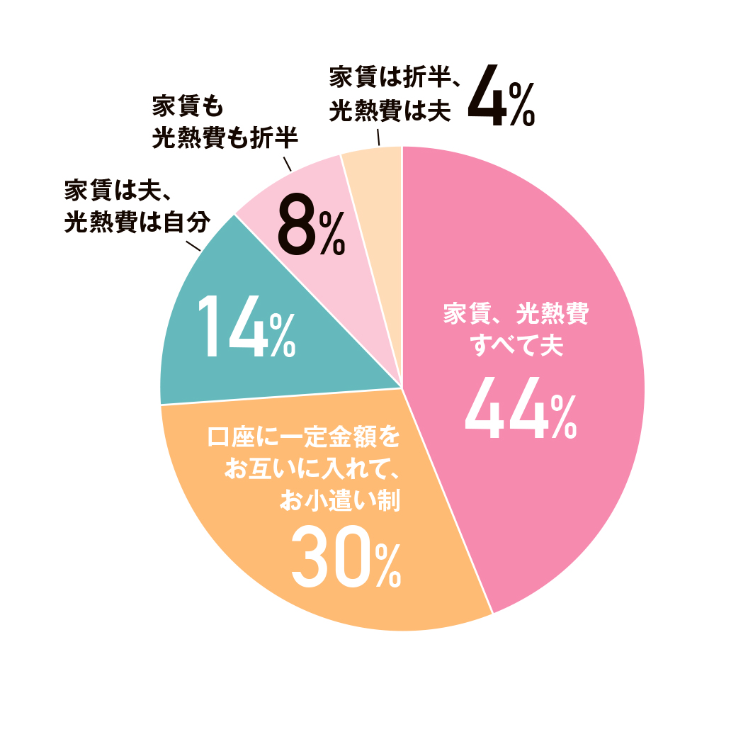 家賃、光熱費は彼が払い、食費やその他の雑費は妻が払うという夫婦が多いですが、口座にお互い決まった額を入れ、そこでやりくりする夫婦も。