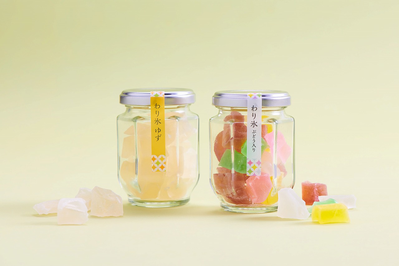 「わり氷」とは石川県金沢市にて創業110年の歴史を持つ老舗和菓子店「和菓子 村上」で販売している、寒天とお砂糖、そして白山の伏流水で作った透きとおった色彩の干菓子のこと。その和菓子 村上と銀座 蔦屋書店がコラボし限定商品を販売中。定番のカラフルなわり氷の他に、ゆずの風味が口いっぱいに広がる「金沢ゆずわり氷」と、ぶどう果汁入りの「ぶどう入りわり氷」がセットになっています。シャリっとした食感は、冷蔵庫に冷やして食べるのがおすすめ。