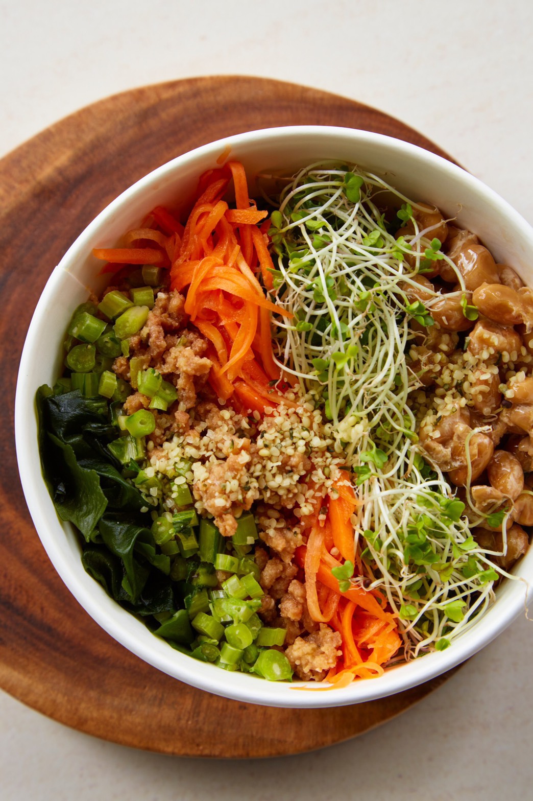 腸活に必須の「食物繊維」。この「ジャパニーズミネラルボウル」は食物繊維が豊富なケールをベースに、海藻やオクラ、スプラウト、キャロットラペが山盛りに。そして発酵食品の納豆、ソイミートのそぼろにミソドレシッングで味付けが完成されています。結構量が多いのですが、バリエーション豊かな具材で飽きずにぺろっと食べられます。 ジャパニーズミネラルボウル/レギュラー ¥1,382 スモール ¥1,058