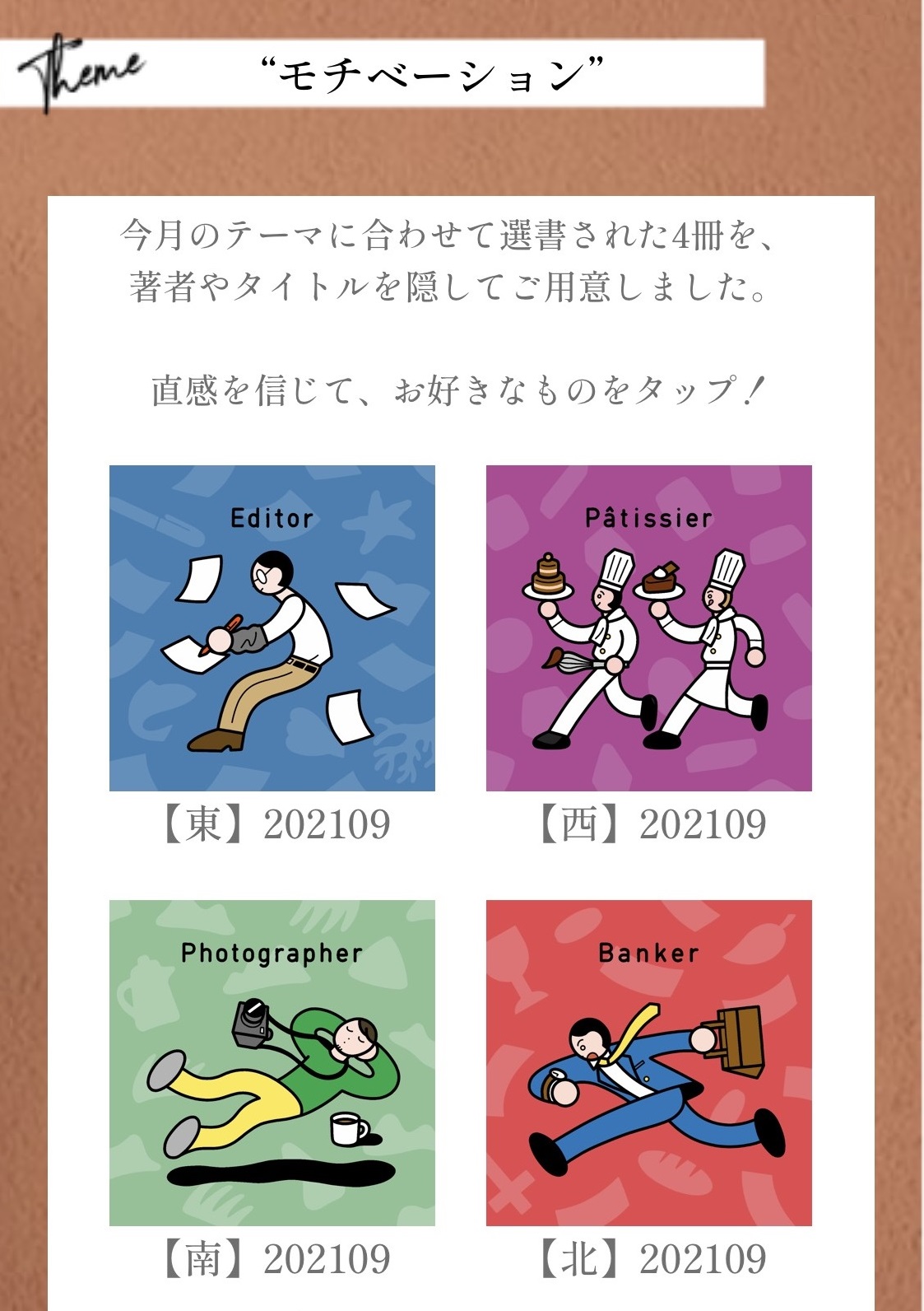 9月のテーマは「モチベーション」。4つの作品の紹介文を読んで、「読みたい!」と思った作品を選びます。この時点では著者も作品も明かされておらず、どの作品なのかは届いてからのお楽しみ。暗~く救いのない話ばかりを好んで読むため本棚が偏りがちな私にとって、普段自分では選べない本が届くというのは新しい読書体験!各作品の紹介文を読んで「あ、これはあの本だな」と予想するのも楽しい時間に。
