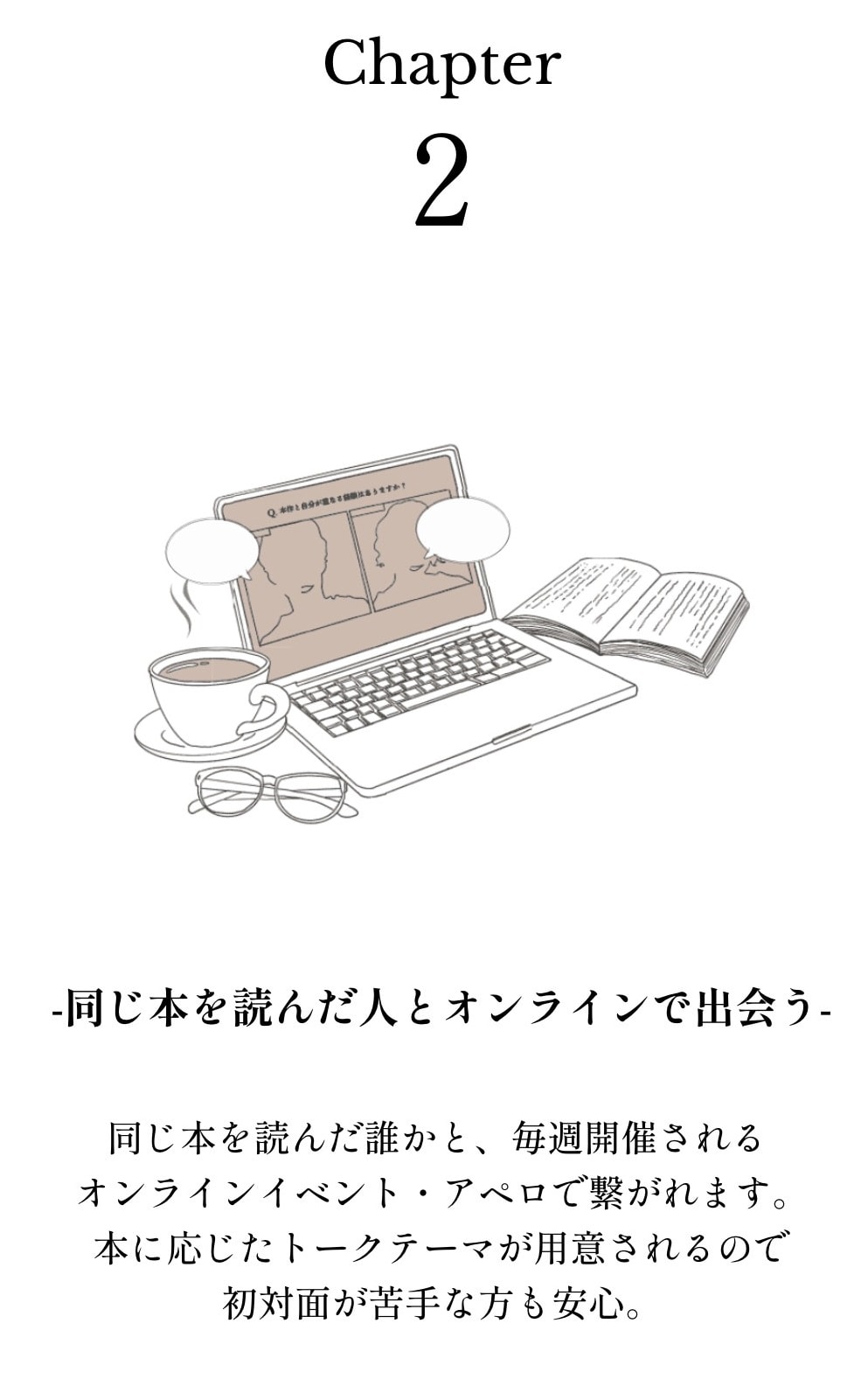 読書というとても個人的な体験を、まだ出会っていない人と共有する。これって、とってもロマンティックなことだな~と。アペロではさらにそこから「好きな作品」「好きな作家」などの情報でマッチングが行われ、感性が似ている人と出会えるというのもうれしいシステムです。初対面の相手との「そうそうそう!」という体験は、人との出会いを特別な瞬間にしてくれるし、恋も生まれやすいはず。「Chapters」でのまだ見ぬ出会いを楽しみに、豊かな読書時間を持てそうです。