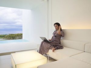 スーツケースから荷物を出して、一息ついたところで、リラックスできる服に着替えてお仕事タイム。近場でワーケーションをする際には、午前中は自宅で、午後はホテルに移動しお仕事を再開します。ラウンジ付きのプランの場合、ホテル内のラウンジでお仕事することも。