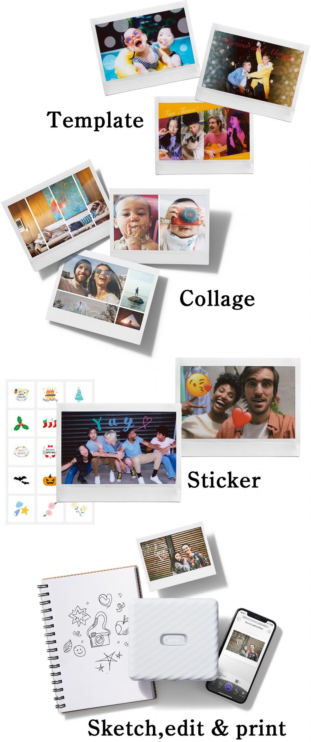 「instax Link WIDE」アプリには写真をおしゃれに演出できる多彩なテンプレートも。複数の画像を組み合わせたり、アプリ内臓ステッカーでデコレーション、自分で描いた絵や文字を画像と組み合わせることも。自分らしいアレンジでとっておきの一枚に!
