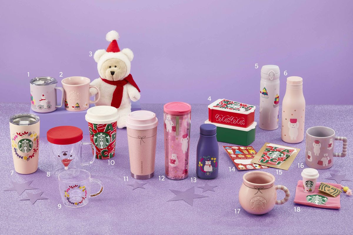 1.『ホリデー2021ステンレスマグパープル355ml』¥3,520、2.『ホリデー2021マグピンク355ml』¥1,980、3.『ホリデー2021ベアリスタボーイ』¥3,300、4.『ホリデー2021ペストリーボックスセット』¥1,650、5.『ホリデー2021ハンディーステンレスボトルパープル500ml』¥4,840、6.『ホリデー2021ステンレスボトルポーラーベア473ml』(オンライン限定商品)¥4,290、7.『ホリデー2021ステンレスタンブラーホワイトリース473ml』¥4,180、8.『ホリデー2021耐熱グラスマグポーラーベアフェイス296ml』¥3,300、9.『ホリデー2021耐熱グラスマグリース296ml』¥2,530、10.『ホリデー2021キャニスターRED CUP』¥2,750、11.『ホリデー2021ステンレスToGoロゴタンブラーパールピンク473ml』¥4,400、12.『ホリデー2021タンブラーポーラーベア473ml』¥2,420、13.『ホリデー2021ステンレスミニボトルポーラーベア237ml』¥3,630、14.『2022スターバックス年賀状3枚セット』¥1,100、15.『ホリデー2021ビバレッジカードRED CUP』¥682、16.『ホリデー2021マグポーラーベア355ml』¥1,980、17.『ホリデー2021マグポットシェイプ355ml』¥2,310、18.『ホリデー2021スターバックスミニカップギフトピンク』¥1,045
