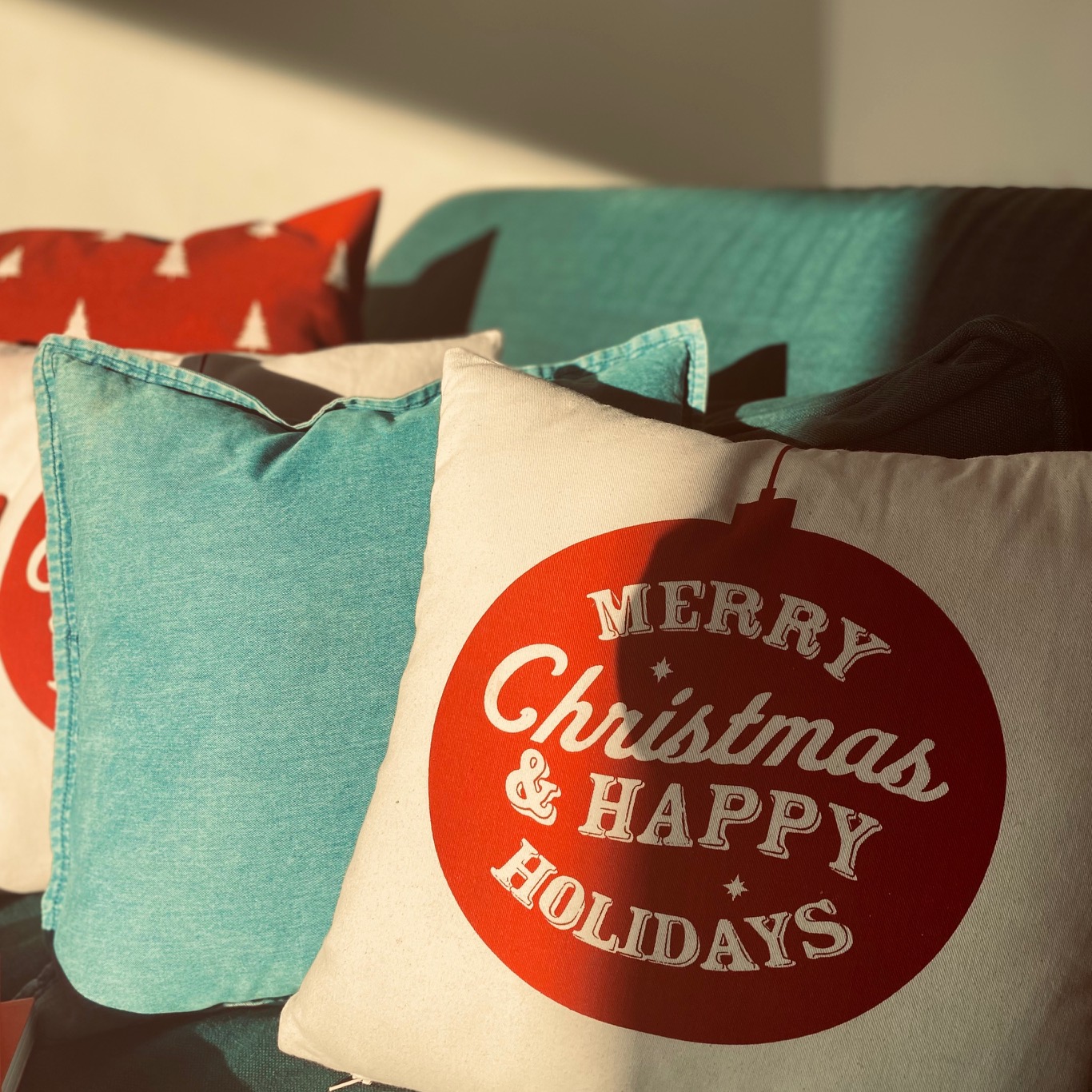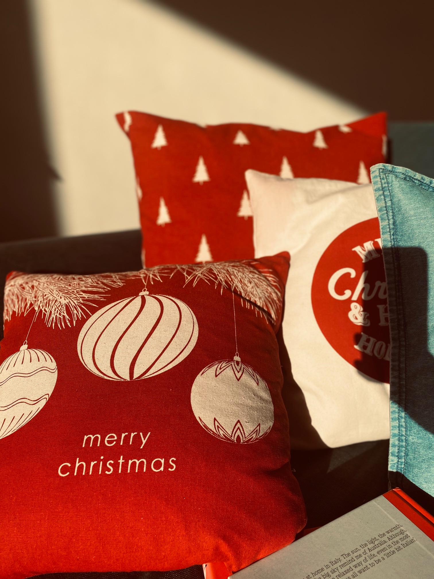 この白地にツリーデコレーション柄のクッションは、去年H&M HOMEで買ったもの。たしかこちらも¥999だったかと思います。ちょっとふざけた雰囲気だけど、それが可愛い!イギリス映画とか観ていると、Xmasシーズンの部屋はやりすぎ!?くらいに飾り付けていて、それがたのしげで素敵だなあと。なのでXmasクッションも4つ、ギュッと集めて置いています。