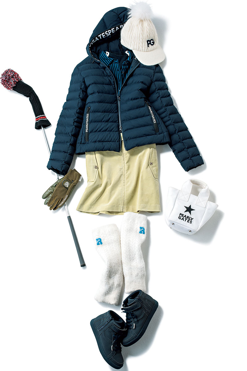 1月のラウンドでは寒さ対策は必須。冬ならではのふわモコ素材や防寒機能を味方にして楽しむ努力をコーデに盛り込んで。ハイネック×シャツのレイヤードに、あったかさを約束するメガヒート素材のダウンがあれば、冬支度が万全に。ニットキャップで頭と耳をカバーし、レッグウォーマー&ハイカットシューズで、全身の冷えをシャットアウト。白小物で抜け感を出すと◎。ダウンジャケット¥45,100シャツ¥22,000ハイネックトップス¥13,200カートバッグ¥13,200ゴルフシューズ¥35,200キャップ¥17,600グローブ¥9,900(すべてパーリーゲイツ)スカート¥18,700(キャロウェイ レッド レーベル/キャロウェイ)レッグウォーマー¥8,250(ロサーセン/グリップインターナショナル)