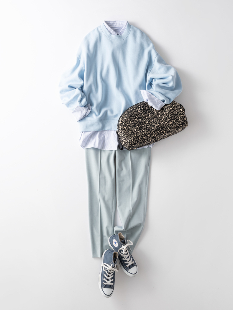 素材違いのペールブルーをレイヤード。シャツをインすることで、notワンツーコーデになり、着こなしにメリハリが生まれます。カジュアルなイメージのスウェットトップスですが、よそいき仕様に。足元は定番コンバースのハイカットで、こちらもブルーをセレクト。