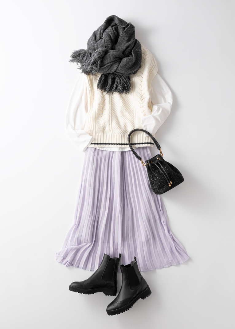 春らしいラベンダーのスカートは、この時期は黒小物で引き締めるのが正解。カジュアルな小物でハズすと照れずに着こなせます。マニッシュなブーツ以外に、スニーカーにも相性がいいプリーツスカートは着回し力も抜群です。