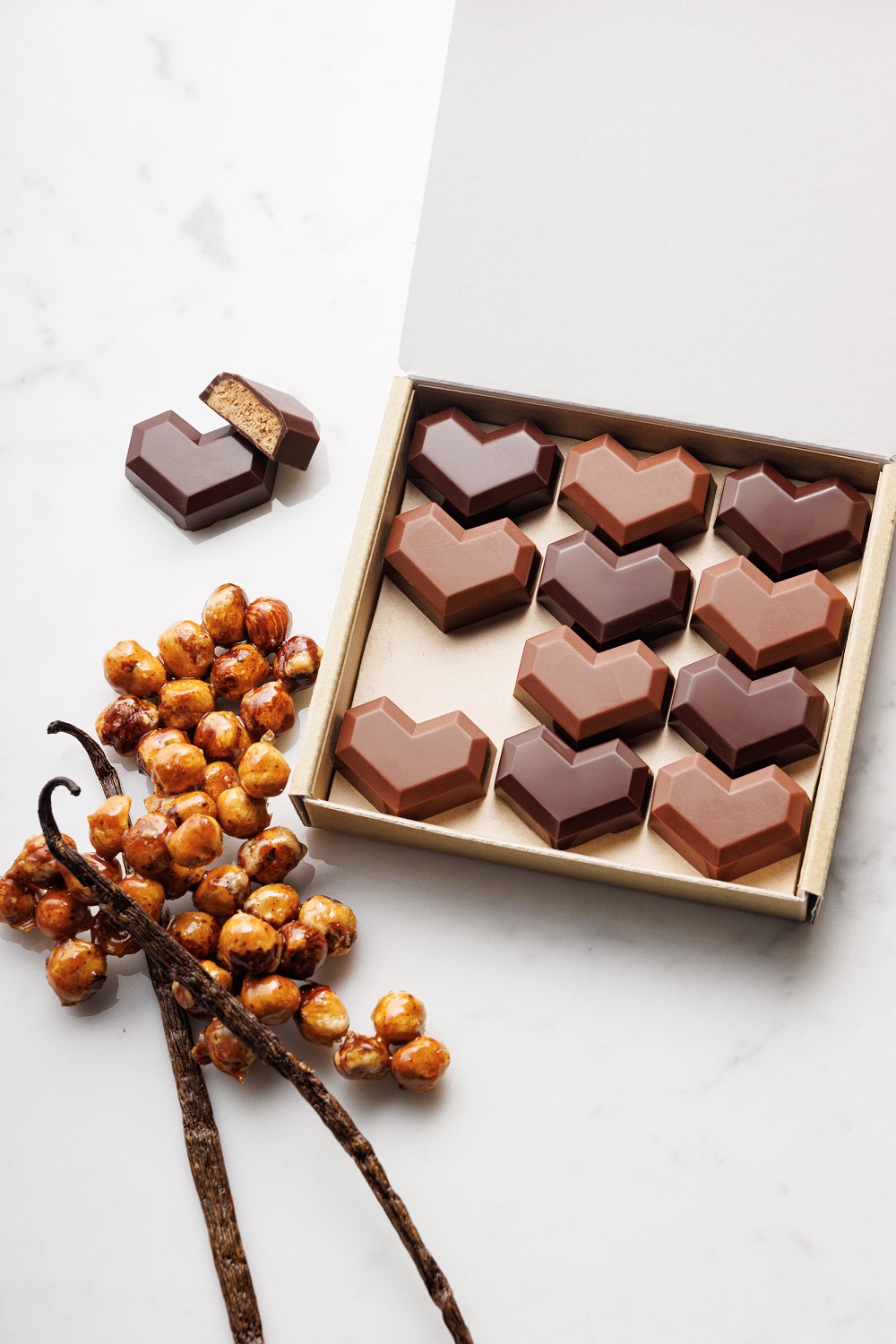 香り高いマダガスカル産のバニラと、風味豊かなイタリア産ヘーゼルナッツを使った香ばしいプラリネがたっぷり詰まったハート型のショコラ。カカオ45%のオ・レとオリジナルブレンド75%のノワールの2種が味わえます。プラリネは深めにキャラメリゼされたナッツを粗めのペーストにしたもので、ザクザクとした食感が楽しい!香ばしい風味とコクが堪能できて、甘いものがそこまで得意じゃない男性にも好まれそう。