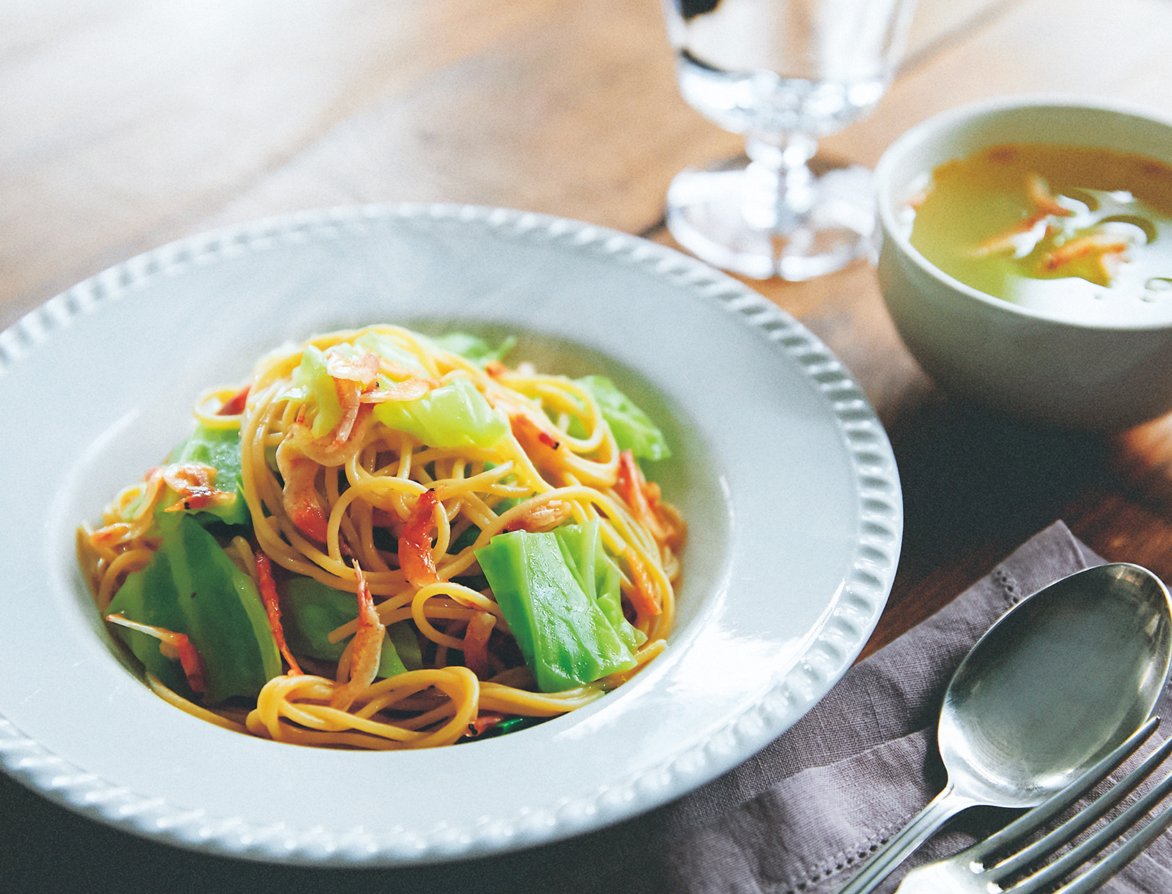- ❸残りの茹で汁にキャベツ、桜えびを入れて塩胡椒で調味し、器に入れてごま油をたらす。