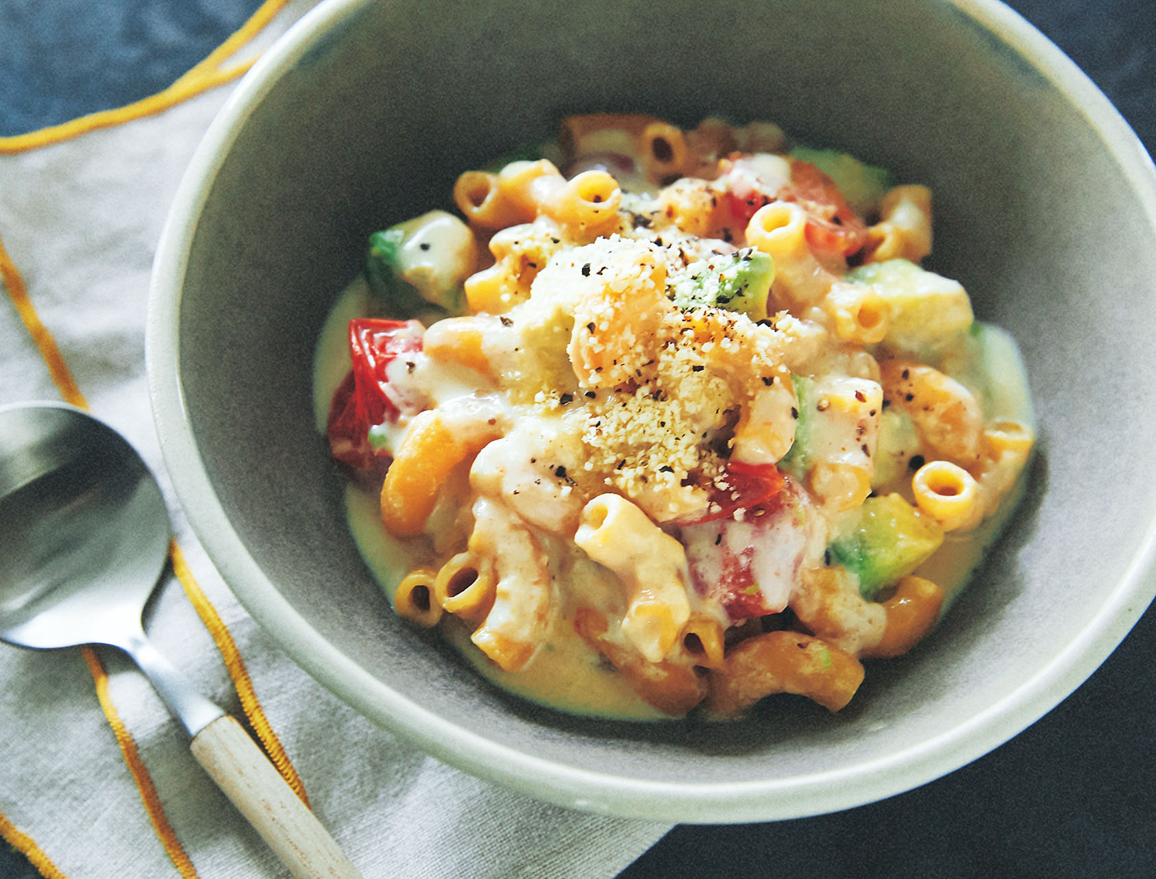 - ❹トマトが柔らかくなってきたら弱火にして②とアボカドを入れて沸騰しないように温めたら、茹で上がったマメロニとパルメザンチーズを加えてさらに2分ほど煮込む。※沸騰させると豆乳が分離するので、弱火で加熱する。