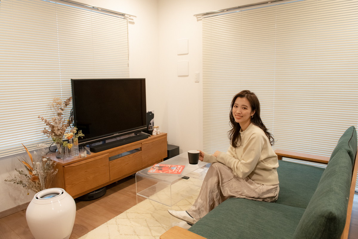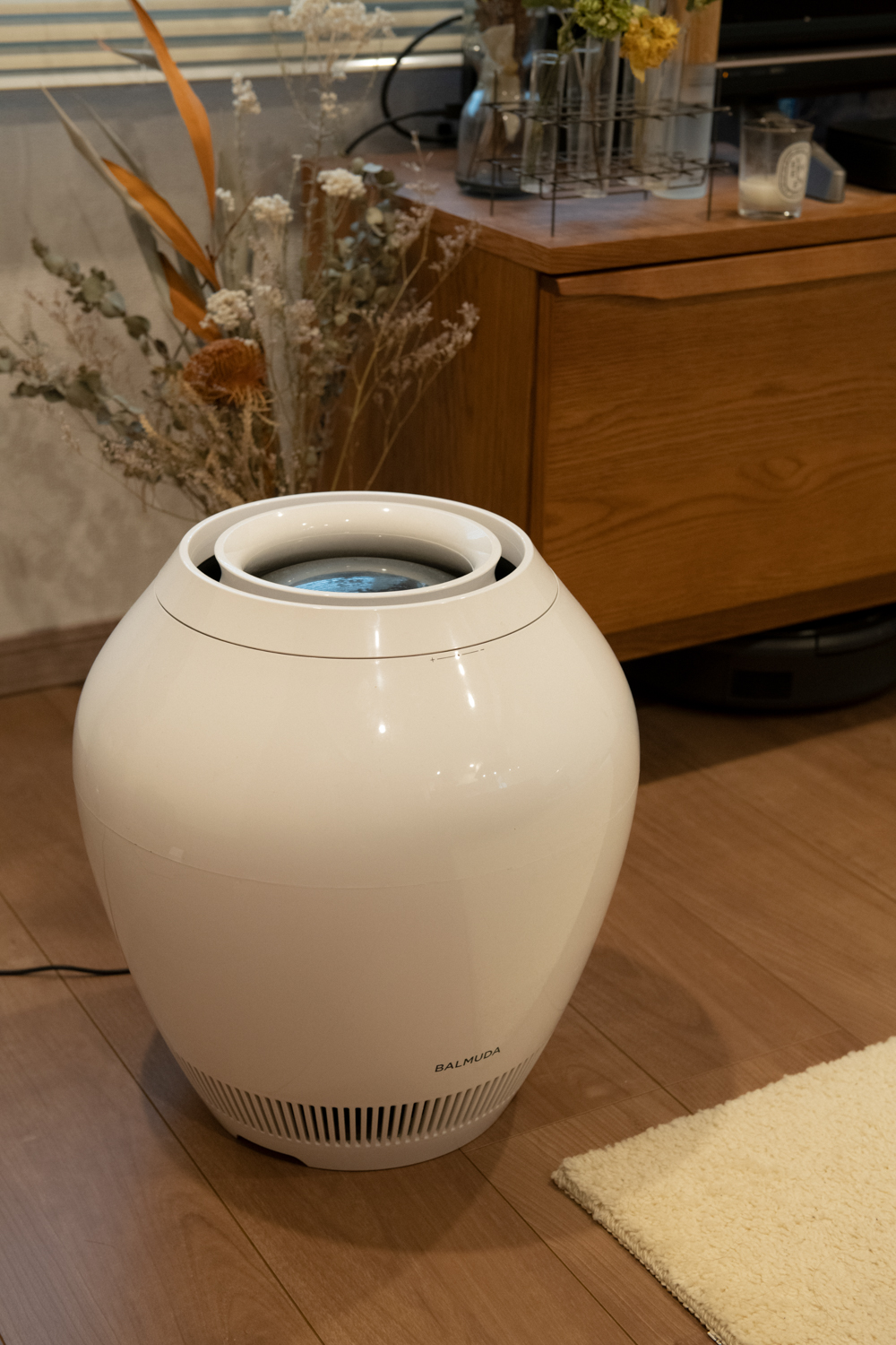 「肌や髪の状態を常に整えておきたいので、冬も夏もリビングは一定の湿度を保つようにしています。バルミューダの加湿器はインテリアみたいなデザインで、ほどよい存在感が気に入っています」