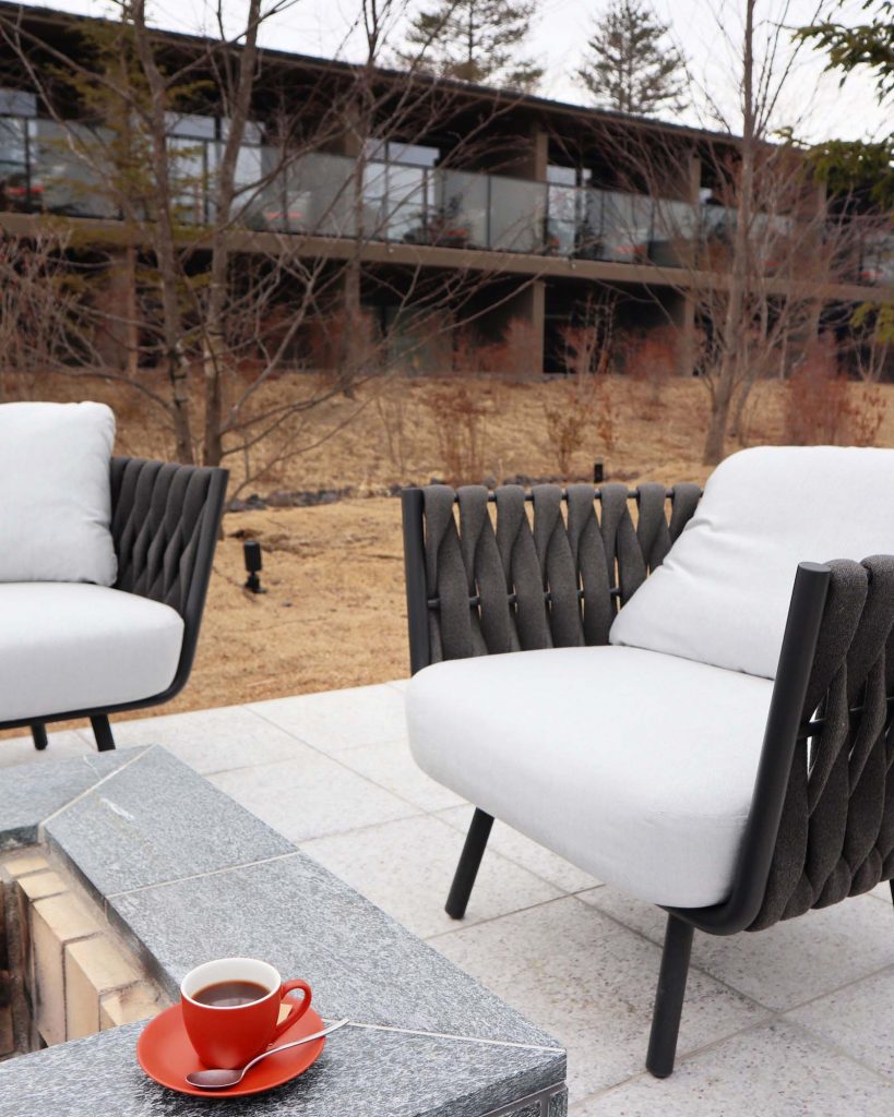 館内はロビーラウンジ、スパ、ダイニング、客室3棟の計6つの棟で構成され、プロムナードがそれぞれを繋いでいます。中央には焚き火を楽しめるフォレストガーデンが設置され、ホットドリンクをサーブしてくれるアクティビティも。(※今後も開催予定はありますが、常設ではありません)