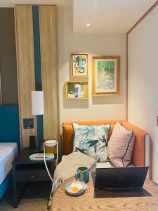 実際にホテル内をいろいろと見てまわると、ブルーだけでなく、高原リゾートらしいグリーンが効いた気持ちのいいインテリア。「ネイバーフッドストーリー」を掲げているホテルだけあり、軽井沢の深い森の雰囲気にマッチしています。燦燦と光が入るロビーは、グリーンのチェアやブルーのライトがアクセント。廊下やお部屋の中にも様々なアートワークがさり気なく飾られていて、ひとつひとつじっくり見るだけでも満たされる♡