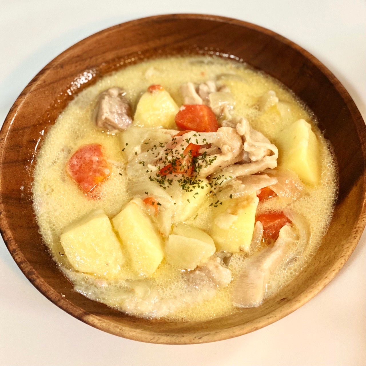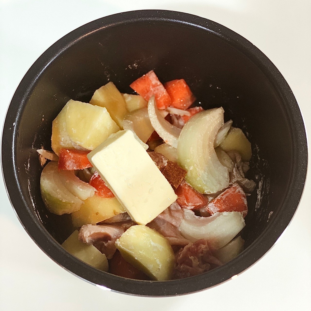 「この日は『クリームシチュー』をセレクト。お鍋で作ることが多いですが、吹きこぼれないようにかき混ぜたりするのはかなり面倒。放置して作れるということで早速トライしてみました。こちらもメニュー通りにセット。ピンが下がったら蓋をあけて牛乳投入、蓋を閉めてしばらく温めます。濃厚なクリームシチューという感じではなかったですが、野菜と鶏肉の旨味がギュッと凝縮されていて美味しい!鶏肉のほろほろ具合が絶妙でした」