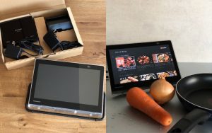 キッチンに持ち込み、夕飯のパエリア作り。画面に油汚れがついてしまっても、モニター部は食器用の中性洗剤で洗えるので、一時停止や巻き戻しをしたい時にも、いちいち手を洗わずそのまま触れてすごく便利!コントロールバーをタッチすれば、タイマー機能も使えるので、加熱時間を測るのもこれ一台で済んでしまいました。