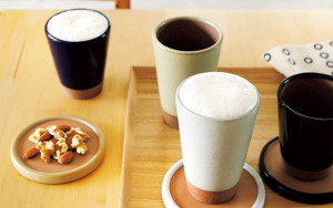 手に収まりがいいスマートなフォルムのカップは、内側に釉薬をかけない素焼きの状態にしています。ビールを注ぐと、表面の小さい凹凸がきめ細かな泡をつくり出し、口当たりのよい美味しい一杯に。水滴を吸収してくれる素焼きのコースターは、おつまみをのせる豆皿としても活躍します。300㎖ 各¥1,430、200㎖ 各¥1,320、コースター各¥1,100(かもしか道具店)