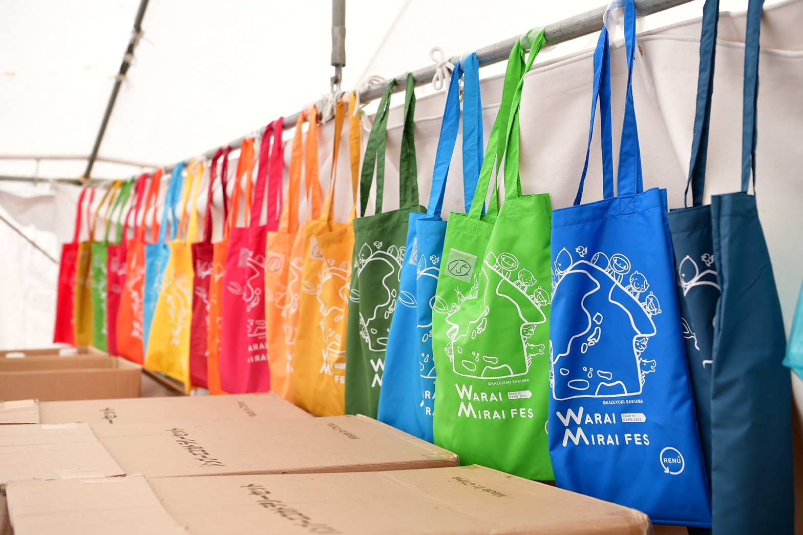 会場では、再生ポリエステルRENU®を使用したエコバッグの販売も。スタンプラリーの景品や食器類を持ち歩くのにちょうど良いサイズで、会場内の散策にもとっても便利。取材班のメンバーでそれぞれ好みのカラーのエコバッグを購入しました。