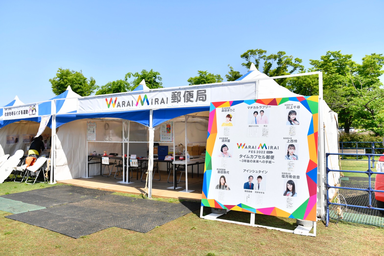 日本郵政によるブース「WARAI MIRAI 郵便局」では、2025年の自分に向けた「タイムカプセル郵便」の投函や、オリジナルフレーム切手の販売等が行われていました。