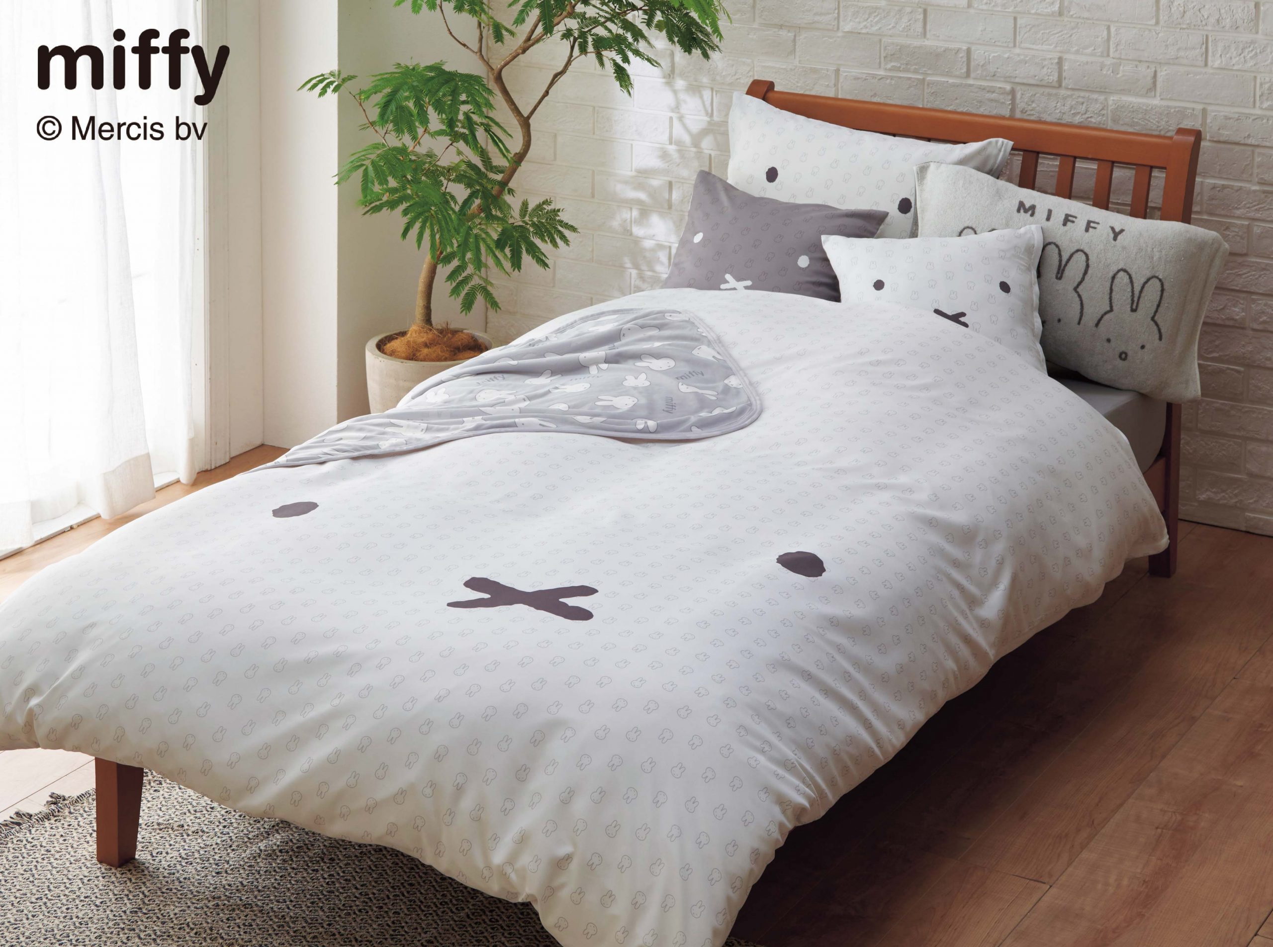コラボレーションアイテムは、バスタオルからミニタオルまで全4サイズのタオル、着るバスタオル、ヘアバンド、アイマスク、クッションカバーです。グレーとホワイトのシックなカラーに、ミッフィーのシンプルな刺繍や、チラッと顔を覗かせるかわいいタグがあしらわれ、大人っぽいデザインに仕上がっています。デザインだけでなく、肌触りや品質にこだわられた、大人女性におすすめなタオルグッズです。また、 ミッフィーの寝装品にも春夏アイテムが新登場!新生活に向け、大人かわいいミッフィーのタオルや寝装品でお部屋のトータルコーディネートを叶えてみては?