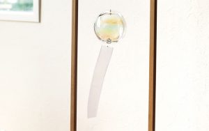 ふわりと空に浮かぶしゃぼん玉をモチーフにした風鈴は、ガラスに特殊な加工を施して、虹色の輝きをたたえています。風に吹かれて奏でる涼やかな音色、光を受けて表情を変える色彩に暑さを忘れて心安らぐはず。フレームがセットになっているから、窓辺に吊るさずとも部屋の好きな場所で揺らぐ風鈴を楽しめます。Mサイズ ウッドフレームセット¥12,100(菅原工芸硝子)