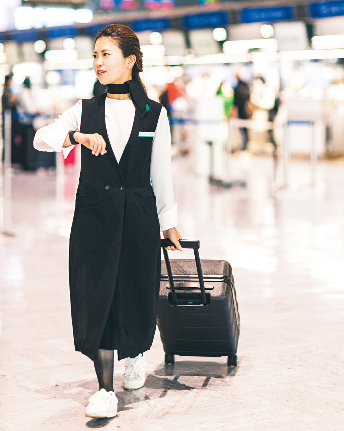 ZIPAIRの制服は、ジレやブラウス、パンツやワンピから自由に組合せて選べるというもの。足元がヒールではなくスニーカーというところも他社との違いだそう。最近は成田ーホノルル路線も戻ってきていて、忙しい日々。