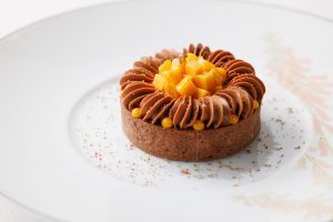 サクサクのショコラのタルト生地の中には、東京工房で丁寧に作られたマンゴーのコンフィと、食感がアクセントになった芳ばしいプラリネフィヤンティーヌの層が。マダガスカル産カカオ45%のショコラとマンゴーとパッションフルーツの爽やかなクリーム、ライムの香りを纏わせたジューシーなマンゴーの織り成す味わいは唯一無二!