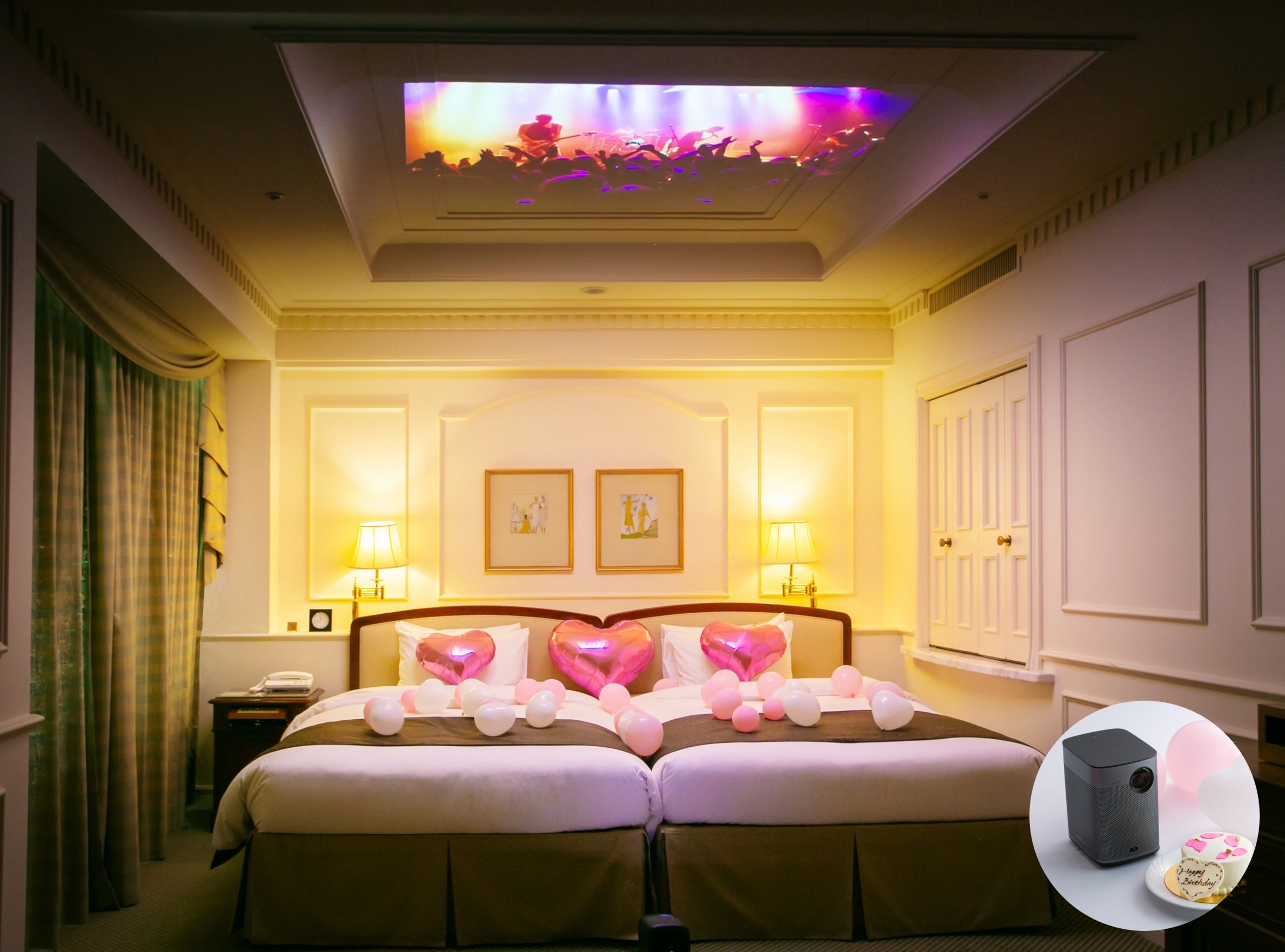 このプランでは、高画質かつ高音質の映像を楽しめるプロジェクター「XGIMI Halo+」が設置されている部屋に、 1 日2 組限定で宿泊可能。「XGIMI Halo+」には、Android TVTMが搭載されているため、YouTube やAmazon Prime、V Live などのアプリを通して、時間や場所を問わず気軽にエンターテインメントを鑑賞することができます。また、スマートフォンとのミラーリング機能もついているため、自分のスマートフォンに保存されているお気に入りの映像も鑑賞可能!天井をスクリーンに見立てて投影し、推しを大画面で眺められるのがポイントです。