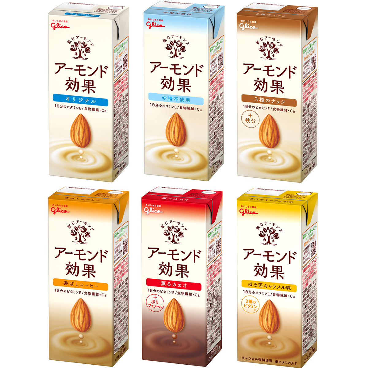 「アーモンド効果」は、気分やシーンにあわせて選べる豊富なフレーバーのラインアップも魅力。ほんのり甘く飲みやすい「オリジナル」に、よりすっきりした味わいの「砂糖不使用」、アーモンド、くるみ、ヘーゼルナッツの香ばしい味わいを楽しめる「3種のナッツ」、やさしい甘さのアーモンドミルクと完熟手摘みコーヒー豆を合わせた「香ばしコーヒー」、カカオとアーモンドの香ばしい味わいとコクを楽しめる「薫るカカオ」、ほのかな苦みとすっきりとした甘みがクセになる「ほろ苦キャラメル味」など、豊富なフレーバーを味わうことができます。