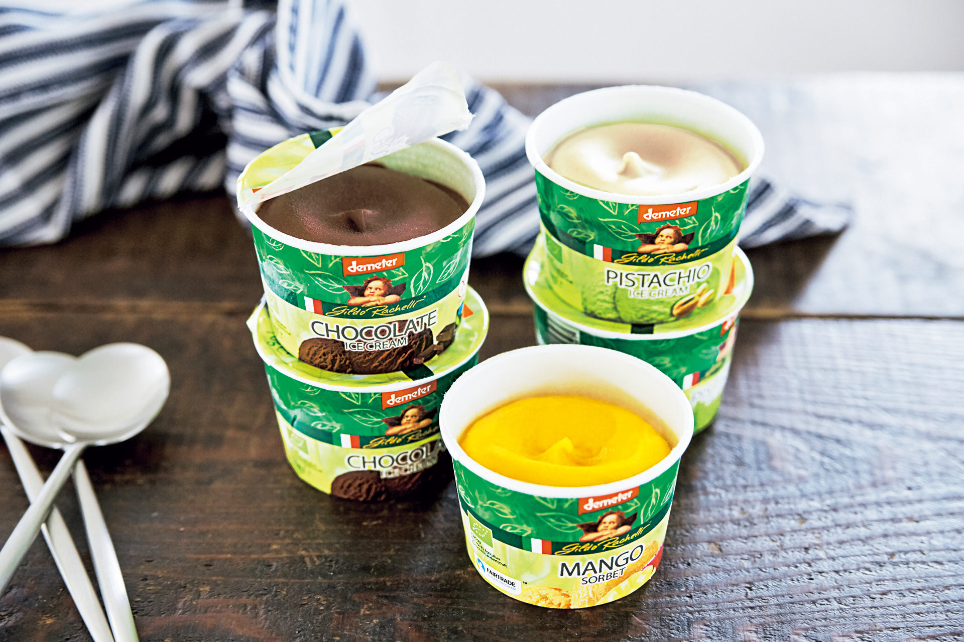 1935年ミラノで創業されたイタリアンジェラート。マンゴー味は厳格なイギリスの菜食主義団体から認定されたヴィーガン製品。右から時計回りに、ピスタチオ[147kcal]、マンゴー[84kcal]、チョコレート[148kcal]各88㎖ 各¥320(すべて薬糧開発/ナチュラルローソン)