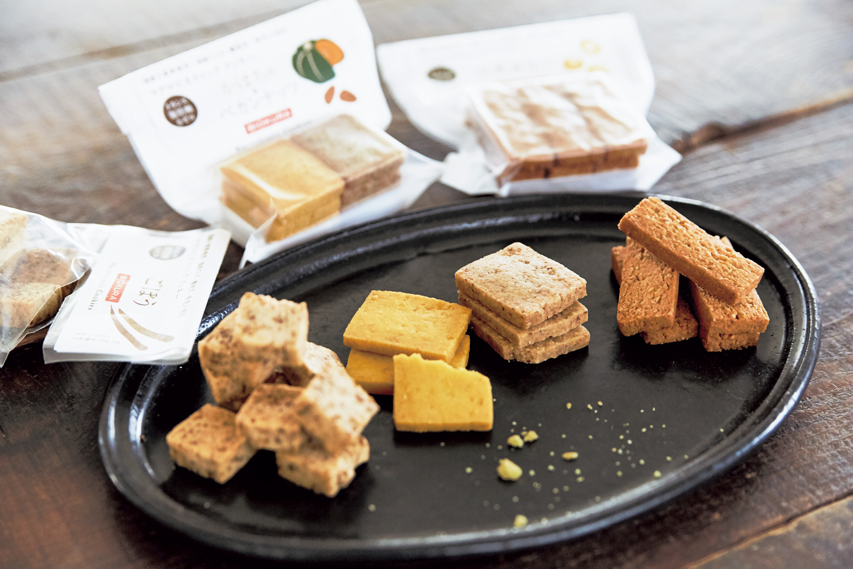 マクロビオティックの考え方に基づいて、国産の小麦や甜菜糖を使った、こだわりのクッキー。トランス脂肪酸ゼロ。右から、豆乳きなこ[243kcal]¥290、かぼちゃ&ペカンナッツ[258kcal ]、ごぼう[242kcal]各¥270(すべてナチュラルローソン)