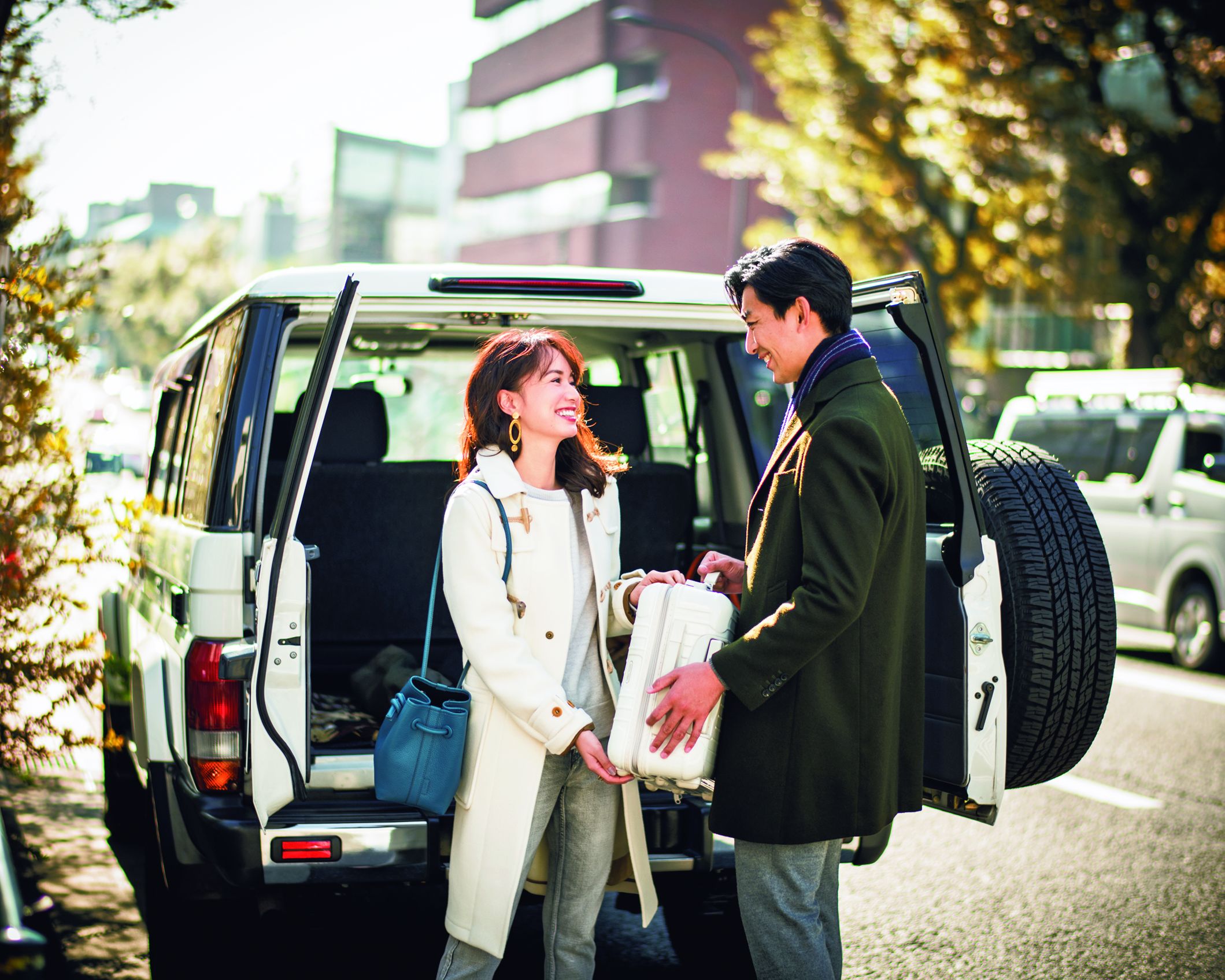 〈女性〉ダッフルコート¥82,000〈グローバーオール〉ニット¥22,000〈ハウント/ハウント代官山〉 デニムパンツ¥24,000〈アッパーハイツ〉(すべてゲストリスト) ピアス¥9,200(ソコ/シップス 有楽町店)バッグ¥36,000(ヴァジック/ガリャルダガランテ 表参道店)〈男性〉コート¥29,000〈ブレザーズバンクドットコム〉パンツ¥11,000〈ユニバーサルランゲージ〉(ともにユニバーサルランゲージ 渋谷店)マフラー¥9,800(スコッチ アンド ソーダ/スコッチ アンド ソーダ原宿店)トランク/スタッフ私物