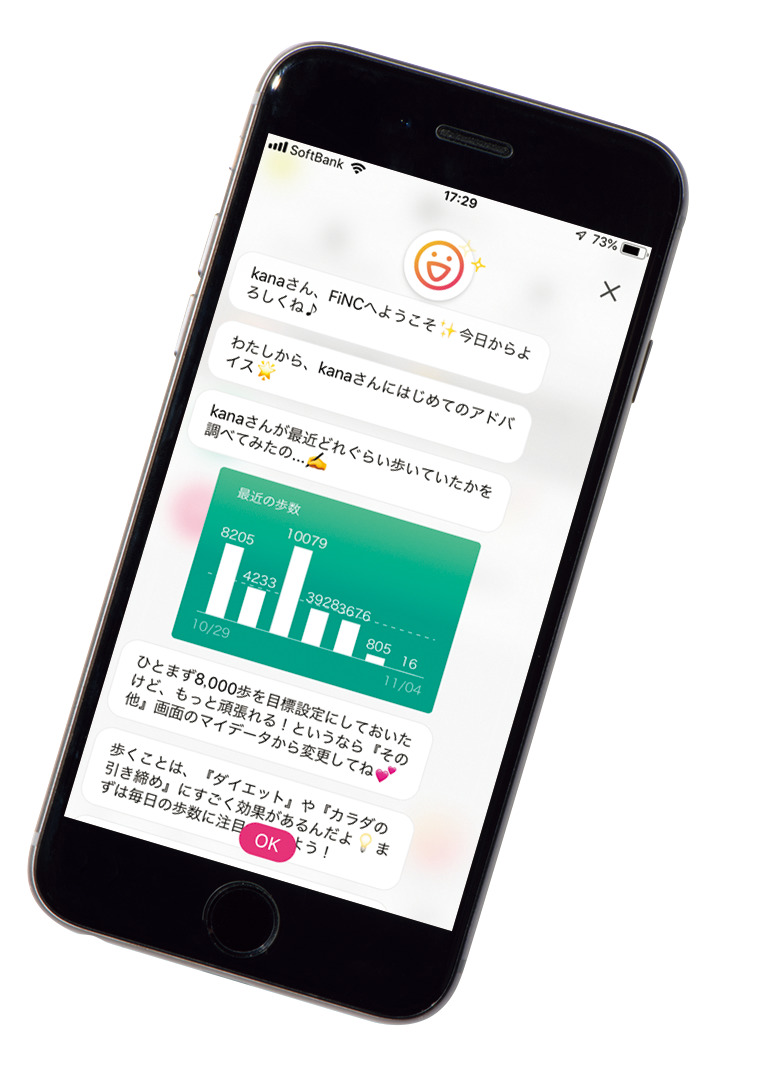 「例えば目標歩数を入れておくと、〝今日はもう3,000歩も歩いたね。エライ!〟と通知がきます。〝いつも頑張ってるね〟って労ってくれたり(笑)。コメントが上手い!」