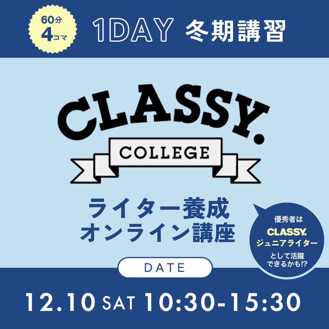 2021年10月の「ライター養成講座」のスタートから、早1年。毎回、あっという間に定員となる人気講座を受講した生徒はのべ400人を超え、卒業生の中にはCLASSY.でライターとしてのキャリアをスタートした方もちらほら。熱意のある受講生からのラブコールにお応えして、初の1日集中プログラムとして「ライター養成講座」冬期講習をオンライン上にて開講します。「伝わる文章」が書けるようになる!冬の短期講座です。