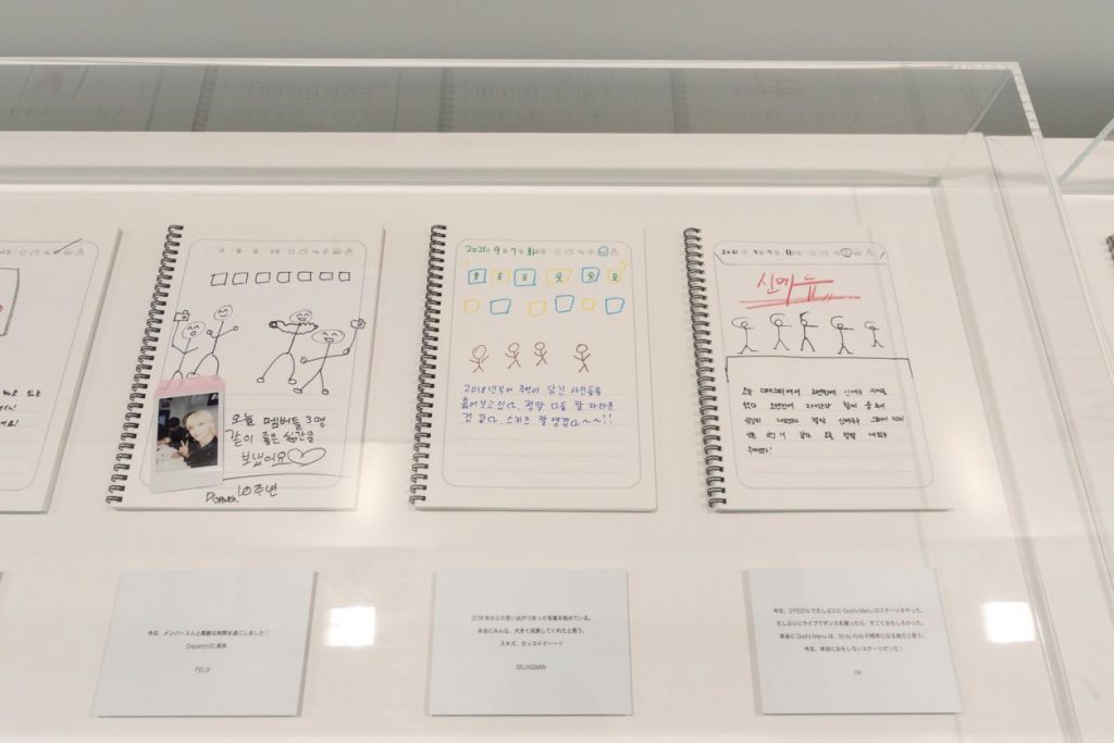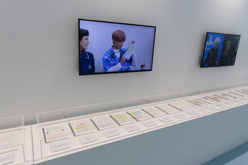 「D’FESTA TOKYOⅡ」にて新登場となった「ダイアリーゾーン」。3分という制限時間の中で、9グループ・69名のアーティストが自由にオリジナルダイアリーを作成する企画を実施し、実際に描かれたダイアリー69点が展示されています。チェキを撮って貼ったり、絵を描いたり…とことん自由に生み出されたダイアリーを通じて、各メンバーの個性を感じられること間違いなし! 日本語訳も合わせて展示されているので、韓国語で書かれたテキストでもばっちり読めるのが嬉しい。設置されたモニターでは、メンバーたちがダイアリーを描いているムービーもチェックでき、さらに展示の後ろを振り返ると、メンバーたちがダイアリーを描いた部屋が忠実に再現されています。