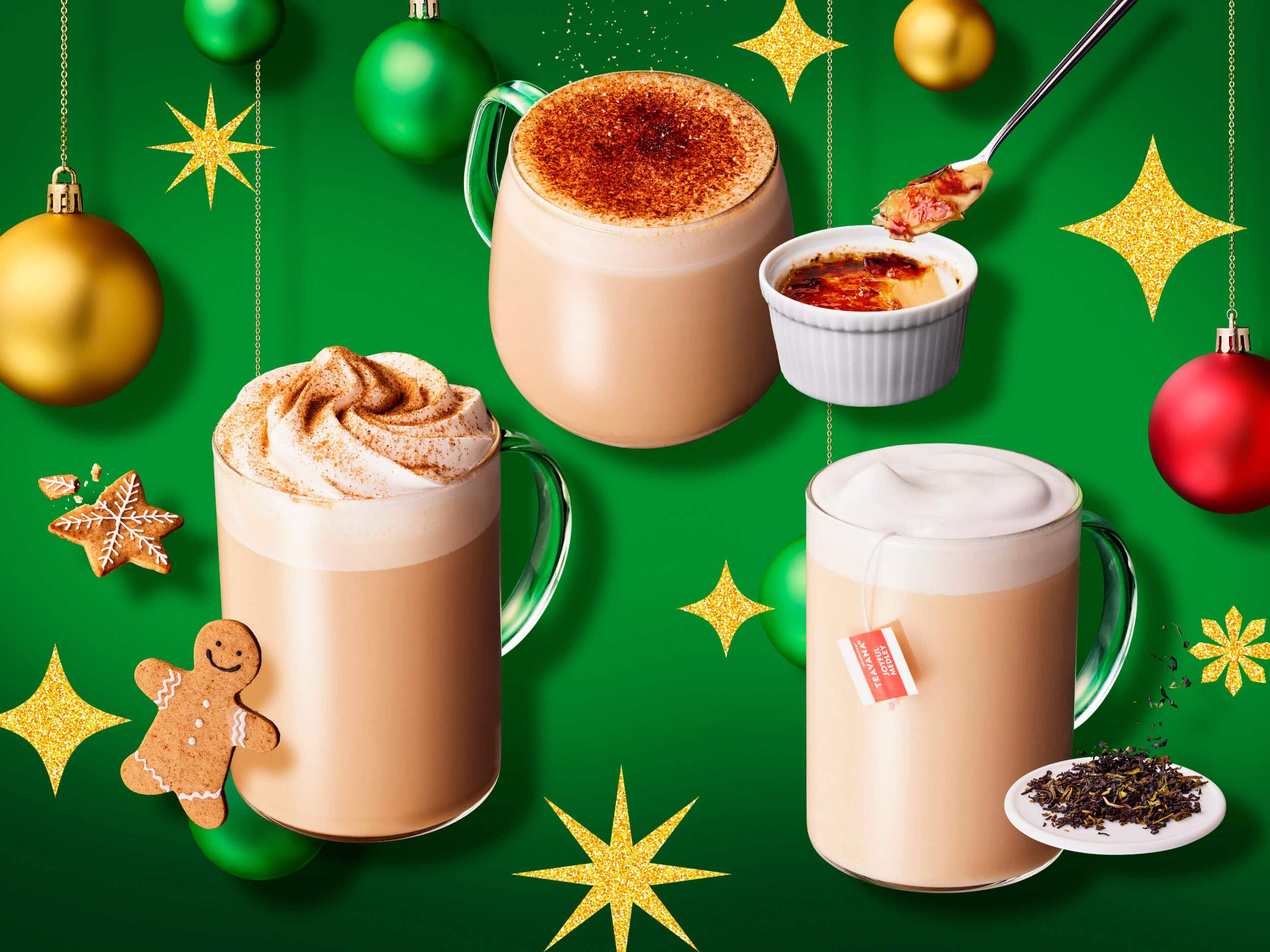 『ジンジャーブレッド ラテ』は、ホリデーシーズンの訪れとともに待ち望むファンが多い、ジンジャーブレッドクッキーのスパイシーな味わいをイメージしたスターバックスホリデーシーズンの定番商品。『ジョイフルメドレー ティー ラテ』は、ホリデーシーズン定番のティーとして人気の高い、ブラックティーとウーロン茶のなめらかな甘さ、ジャスミンティーの花のような香りをブレンドしたティーに、アプリコットの華やかな風味がアクセントのTEAVANA™ ジョイフルメドレーに、スチームミルクを注いで仕上げたやさしい味わいのティーラテです。昨年登場し大好評だった『クレーム ブリュレラテ』は、クリーミーなカスタード風味のソースと、エスプレッソ、スチームミルクを合わせ、クレームブリュレの焦げた天面をイメージした、シュガーをトッピングしています。これらのビバレッジはシーズンを通して楽しむことができます。その日の気分で選べて、誰かの笑顔につながる心も温まるホリデービバレッジの選択肢として用意されています。