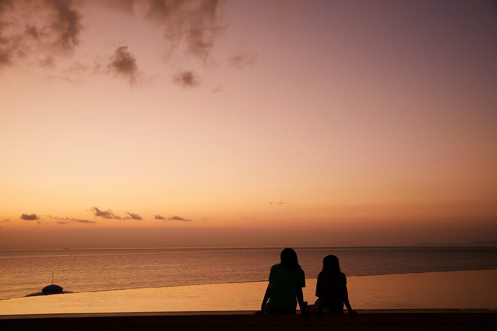 「SHIRAHAMA KEY TERRACE HOTEL SEAMORE」の映えスポットといえば、インフィニティ足湯。太平洋を独占したような圧巻のロケーション、天気のいい日は海の向こうに徳島県のシルエットを確認できます。宿泊しなくても無料で利用が可能、南紀白浜の新名所としても話題です。「きれいな海を独占した気分。この景色とちょうどいい湯温、いつまでもここにいられそう」と黒谷さん。横幅30mのワイドサイズ、一列に並ぶスタイルで視界を遮られることなく絶景を楽しむことができるのも魅力です。
