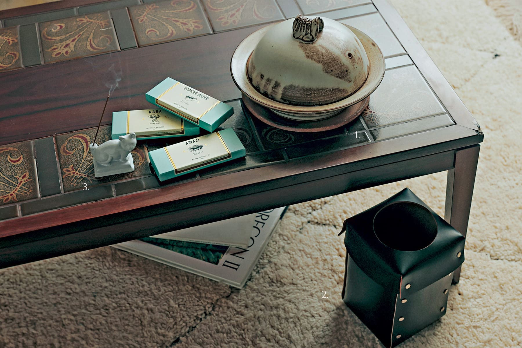 1.ろくろ挽きにてひとつひとつを手作業で制作。ラジウムは食材を美味しくする効果も。ラジウム釉蒸し器¥25,000(矢筈窯)2.インテリアとしても使えるデザインも魅力。assemble dust box¥14,300(エンダースキーマ)3.〝香りの世界一周〟をコンセプトにした、フランスの陶器ブランドのお香。インセンス〈上から順にNamche Bazar、NARA、AWAJI〉各¥6,820 インセンスフォルダー Minou Cat¥17,600(すべてアスティエ・ド・ヴィラット)