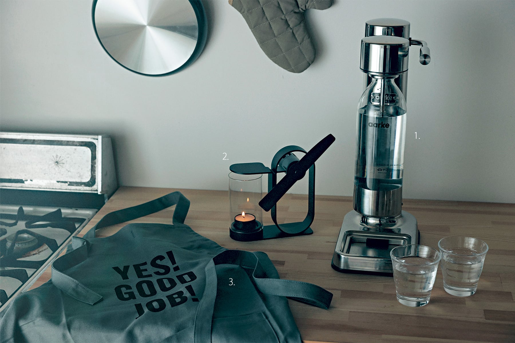 1.スウェーデン生まれの炭酸水マシン。オシャレな専用ペットボトルつきで持ち運びにも便利。Carbonator 3¥33,000(アールケ/モダニティ)※水漏れを防止するドリップトレイつき 2.電気を一切使わずに、ロウソクの熱源だけでそっと香りを運ぶ革新的なアロマディフューザー。Lei non electric aroma diffuser¥24,900(Lei)3.遊び心をきかせたロゴメッセージが料理のモチベーションアップに一役。エプロン¥11,550(ドレスセン)