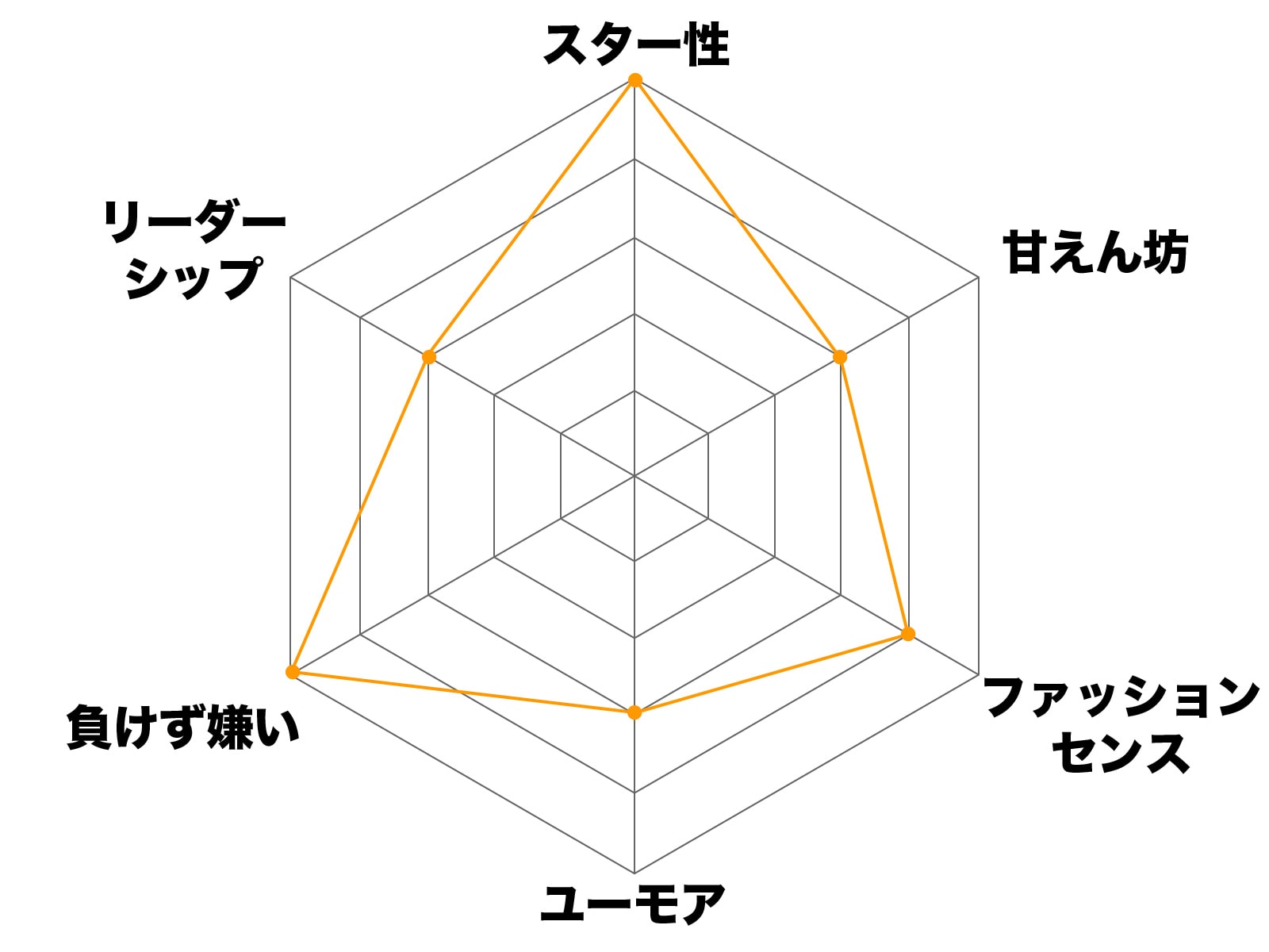 中村:スター性を5にしました(照)。ぶっちゃけ、自分を客観的に見たスター性となると正直5かどうか…という感じなんですけれど、理想として。デビューするからには、スター性はMAXでありたいな、という願望を込めての5です。負けず嫌いについても5です。僕たち、共同生活をしているんですけれど、ゲームだったり、しょうもないことで、すぐに負けず嫌いを発揮してしまいます(照)。今後のアーティスト活動についても、負けず嫌いで食らいついていきたいですね。