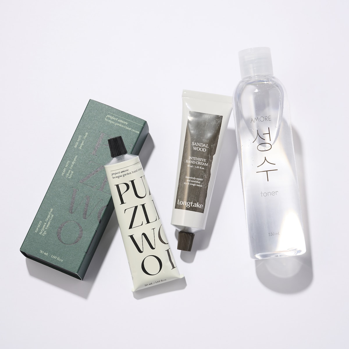 [右から]聖水トナー 230mL ₩10,000 ロングテイク サンダルウッド ハンドクリーム 50mL ₩18,000 パズルウッド ハンドクリーム 50mL ₩21,000