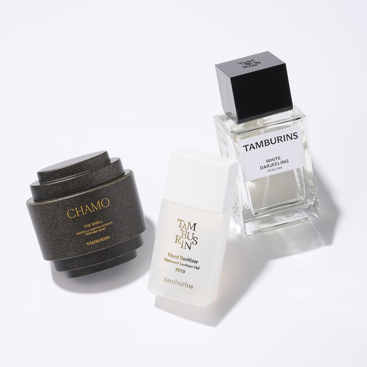 [右から]PERFUME WHITE DARJEELING 50mL ₩129,000 HAND SANITIZER FEY9 30mL ₩8,500 PERFUME SHELL × CHAMO 30mL ₩32,000