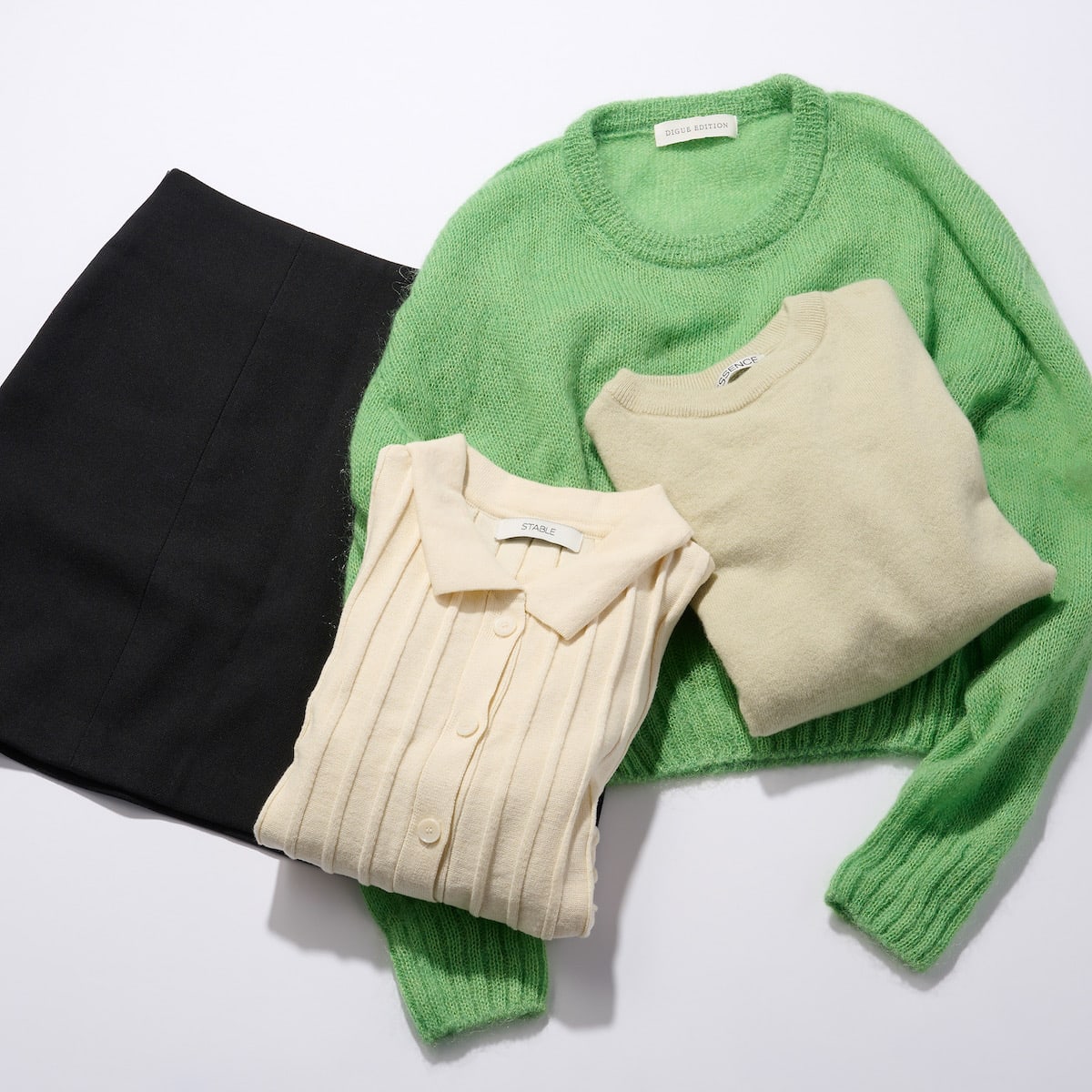 カロスキルにある、セレクトショップ「vase」には、カラバリ豊富で思わずゲットしたくなるニットアイテムが盛り沢山♡ トップスを中心に計4点をGETしました。「ミニ丈ニットには、袖が長めの作りでスタイルアップが叶うものが多い印象。低身長さんにもおすすめです」(by ライター石津)