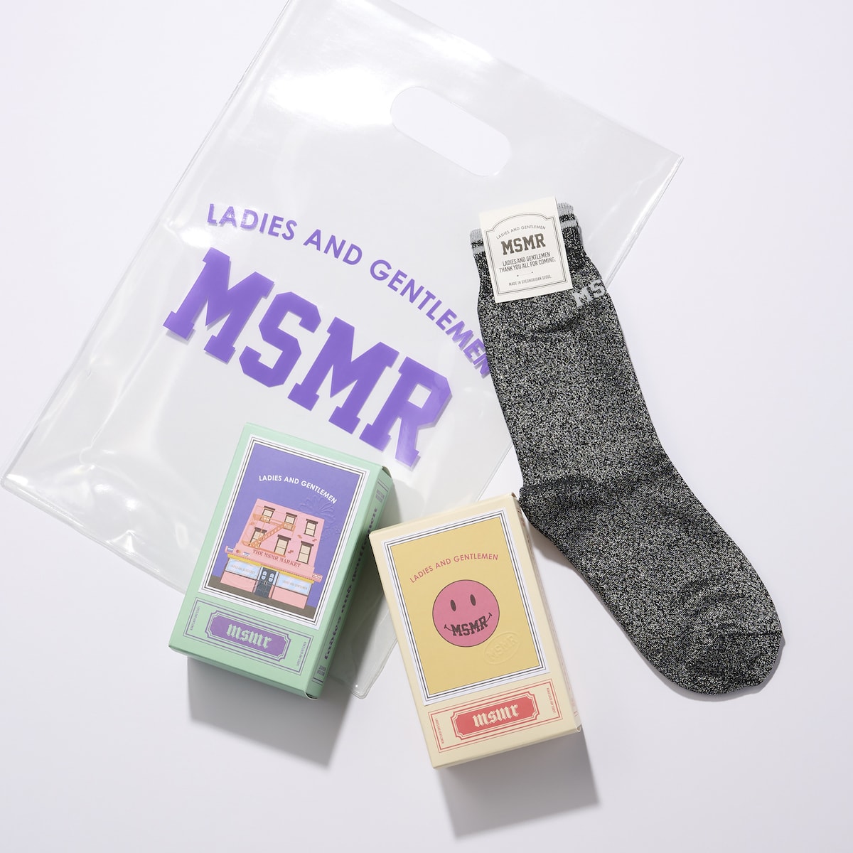 種類豊富な靴下を取り扱う専門店「MSMR」。靴下だけでなくトートバッグなどの小物もあり。オリジナルステッカーとボックスを選んで一つずつ包装してくれるサービスも。ショッパーは丈夫なビニール。こちらもボックス同様デザインも選ぶことが可能。「何足あっても困らない定番の白ソックスやラインソックスやちょっとした外しとなる靴下もたくさん!コーデの幅が広がりそう」(by スタイリスト阿部)