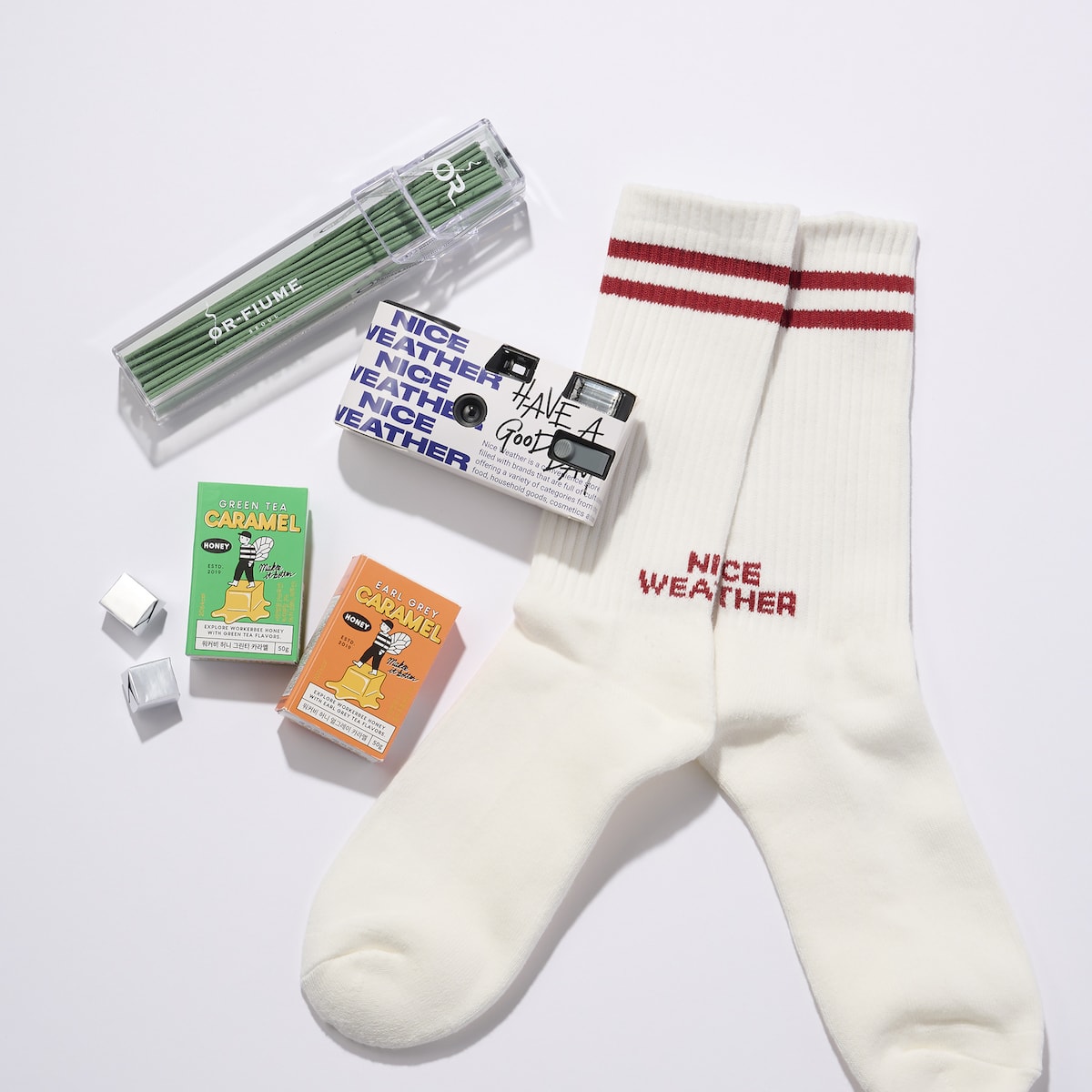 [右上から時計回りに]靴下 ₩9,000 キャラメル[右から]アールグレイ味, グリーンティー味 各₩3,000 OR-FIUME お香 ネロリ ₩29,000 カメラ ₩23,000、
