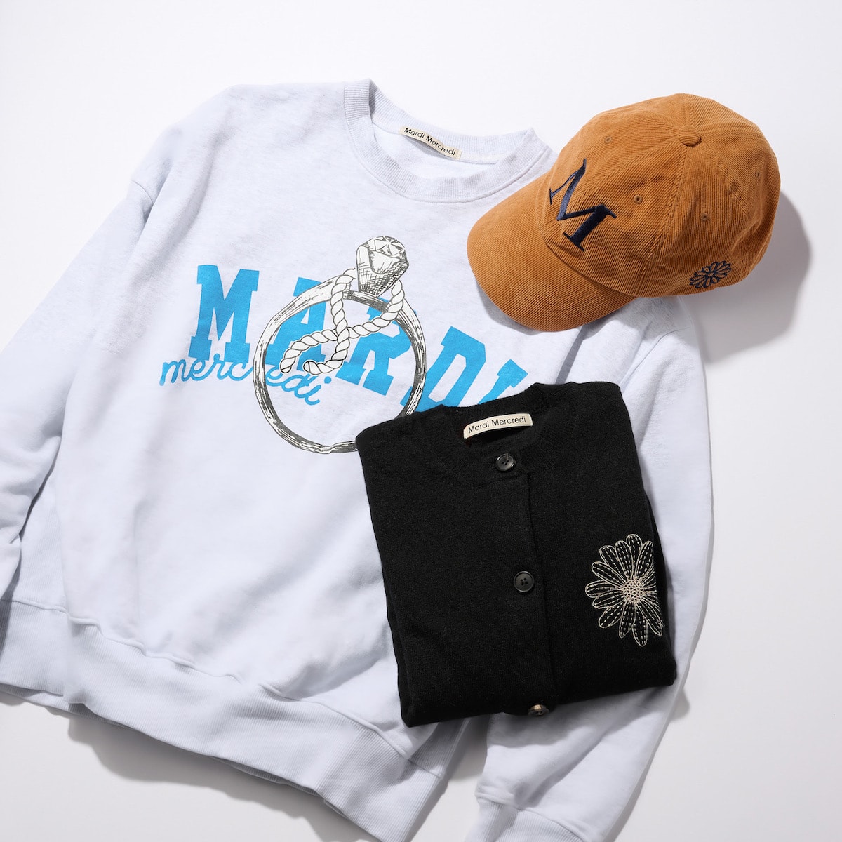 大人気ブランド「Mardi Mecrdi」ではこちらの3点を購入。スウェットはフリーサイズ。デザインの種類も豊富で選びたい放題♡ コーデュロイ生地のキャップは1点投入するだけで主役に。定番フラワーモチーフの刺繍入りカーディガンはどんなコーデにも馴染む万能さ。「高身長にとっては、袖丈も長めなのが嬉しいポイント♡ 日本では買えないアイテムがあるのもいい!」(by スタイリスト阿部)